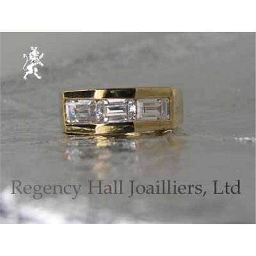 This ring is very unique. Octagon cut Pure White Cubic Zirconium Stones set into the crown of the ring end to end. Plenty of high polish around the stones. Again a great ring for sport or dress. It is hand crafted, and the stones are hand set. The ring is Heavy 18k Gold Plate over Solid Sterling Silver. Size 7.