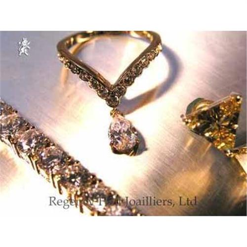 Read this description. Know what you are buying. Brilliant 8x6 mm Pear white stone, Cubic Zirconium, dangling from an 18k gold plate on Sterling Silver V shaped ring paved in a scalloped array with Pure white Flawless Cubic Zirconium. This ring was created in the early eighties by Regency Hall Joailliers, Ltd.