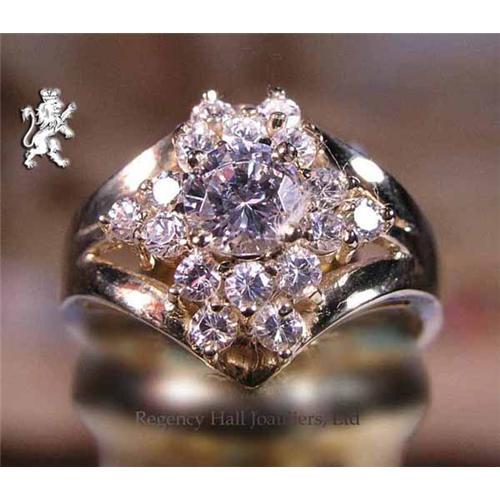 Read this description. Know what you are buying. Brilliant Pure White Flawless Cubic Zirconium in a Modern, High Polish 18k Gold plate on Sterling Silver Ring for a warm look. Will go anywhere, and do anything with style. See in the photos how well this ring goes with earrings and bracelets of all colors. This ring was created in the early eighties by Regency Hall Joailliers, Ltd.