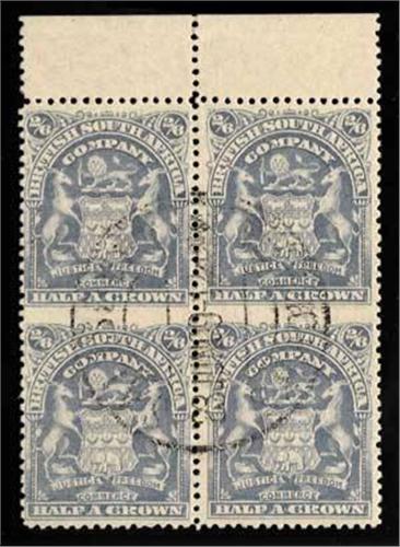 1898-1908 2s 6d bluish grey var imperf between vert pair (SG 85a) top marginal block of four, fine used with central Salisbury cds, BPA Cert (2004), cat £1,000+