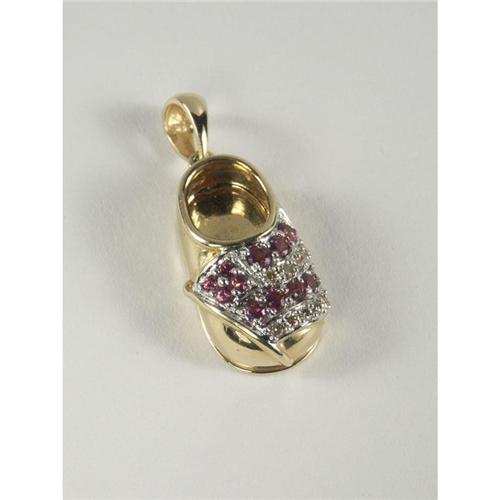PENDANT: Darling 14k yellow gold baby shoe pendant set with rhodolite garnets and diamonds in the form of a flag. The round cut garnets measure approximately 0.30 ctw, are transparent, and are purplish pink. The round cut diamonds measure approximately 0.11 ctw, have VS1 to VS2 clarity and are champagne. Appraisal included.