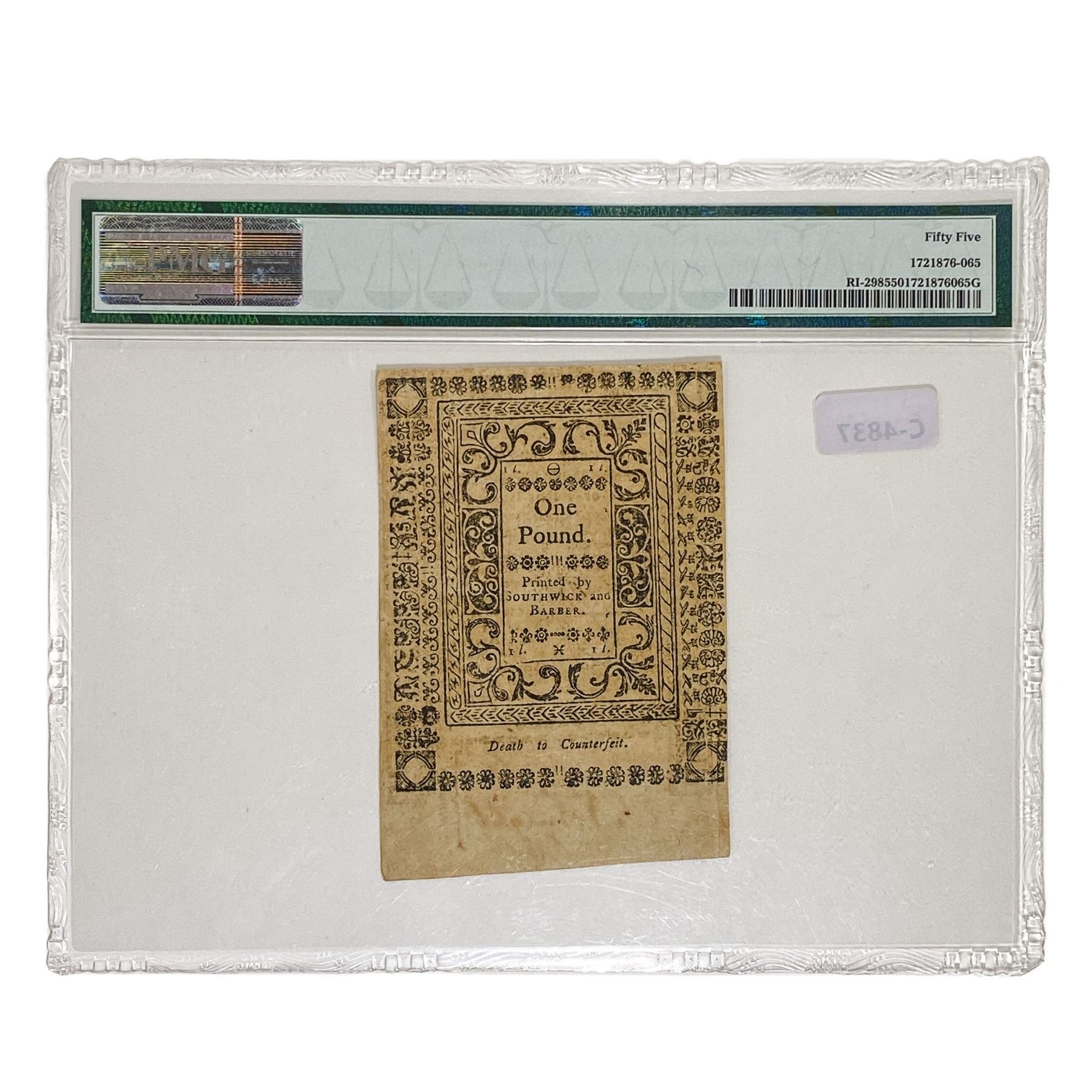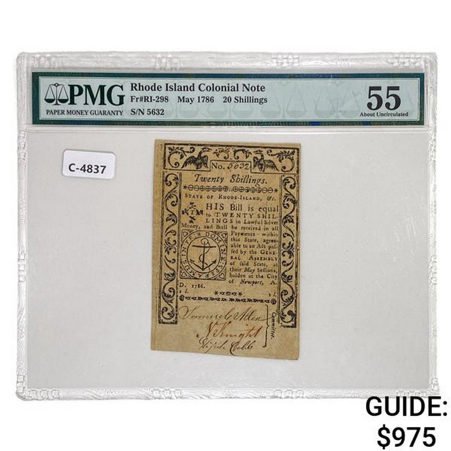 RI-298 MAY 1786 20s TWENTY SHILLINGS RHODE ISLAND COLONIAL NOTE PMG ABOUT UNCIRCULATED-55