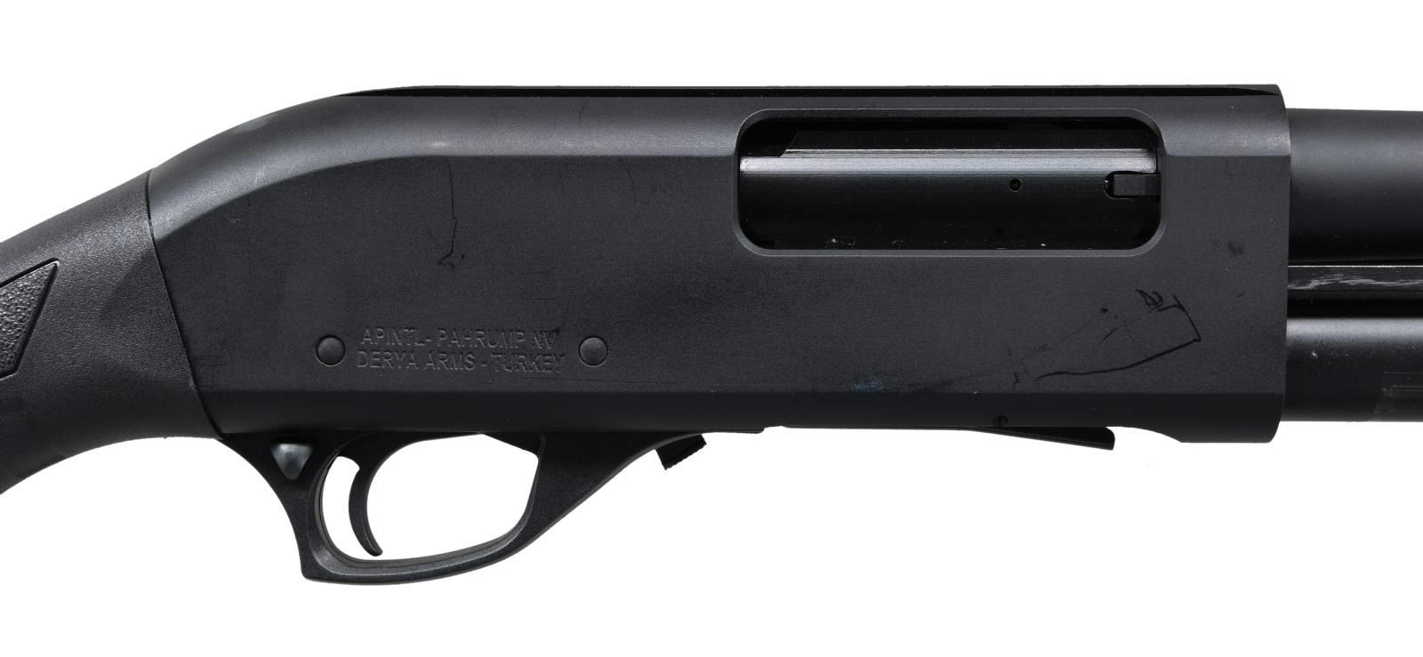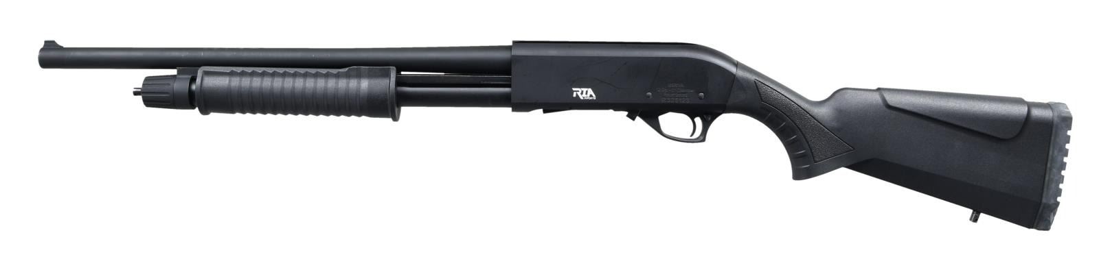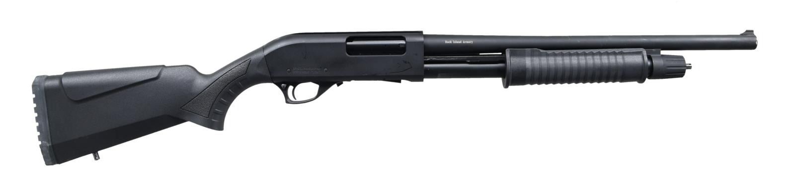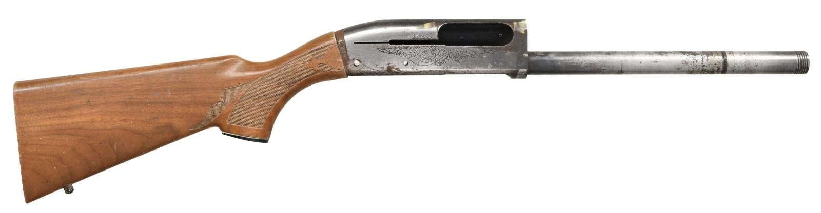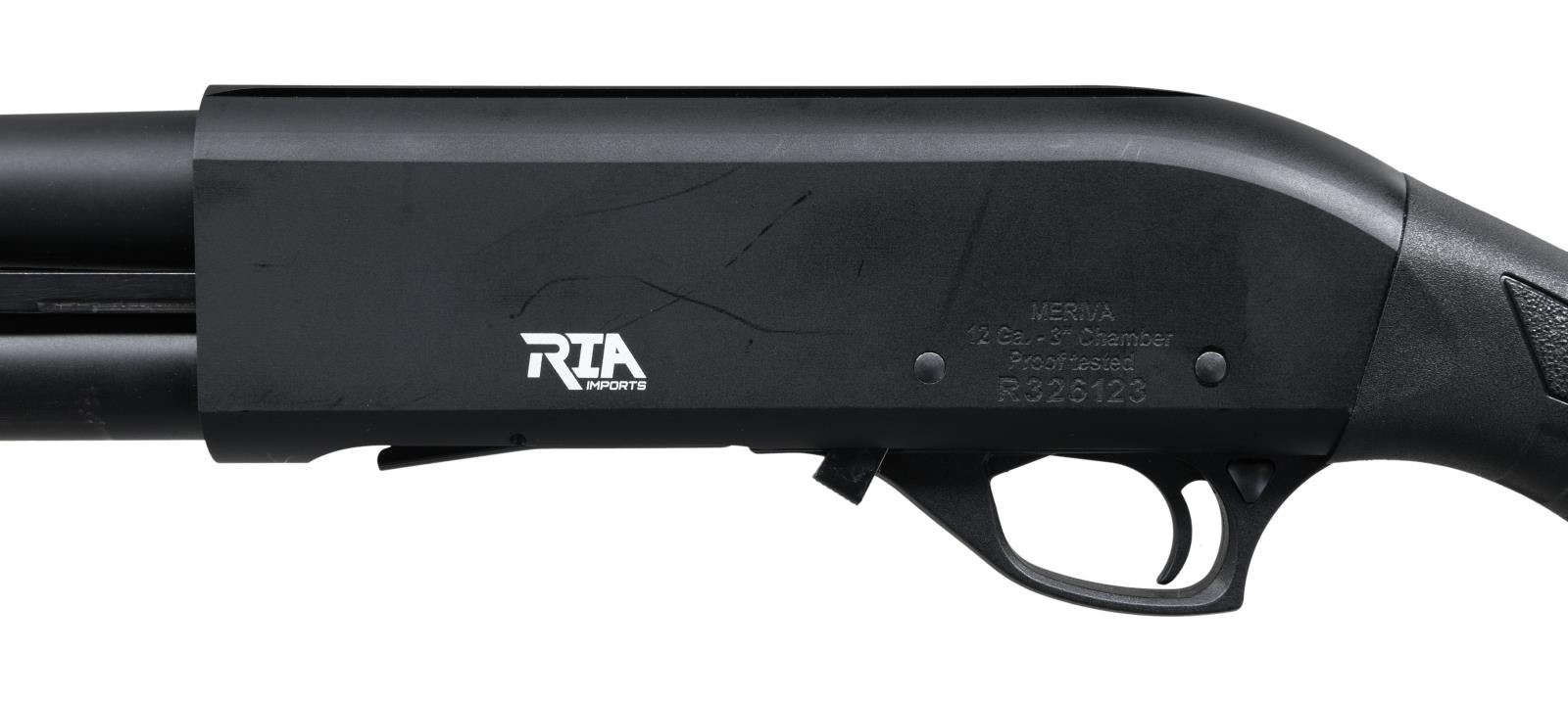 & REMINGTON 1100 PARTS LOT. 1) RIA MERIVA . Cal. 12 Ga. 3". S# R326123. Bbl. 18 1/2". Bead front sight. Home defense style shotgun. Pistol grip stock & grooved forend w/ bottom mounted sling swivels. CONDITION: stock set shows light handling wear. Metal retains 95% original phosphate w/ light scratches & handling wear. Very good plus bright bore. (23-1470/MJC). 2) INTRAC EAGLE 96. Cal. 12 Ga. S# 9806416. Bbl. 19" smoothbore. Chinese made Ithaca 37 clone. Notch rear sight mounted on receiver rail. Ramped blade front sight. Checkered pistol grip stock & grooved forend w/ bottom mounted sling swivels. CONDITION: stock set has added varnish w/ scattered flaking, light handling wear & dings. Metal retains 90% original blue w/ a couple spots of light oxidation, scattered operational & handling wear. Very good bore that will likely clean up better. (23-1474/MJC). 3) REMINGTON 1100 PARTS LOT. S# M246982V. This lot consists of a Remington 1100 pistol grip buttstock w/out buttplate, grip cap, rear sling stud, stripped receiver & mag tube w/ out internals or end cap. The stock shows a 1" crack behind receiver, scattered staining & handling wear. The metal parts are a silvery gray patina w/ scattered oxidation & pitting. (23-1475/MJC). ALL MODERN. $400-600.