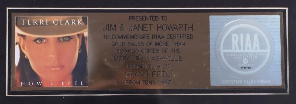 RIAA Certified Gold Sales Terri Clark "How I Feel" Record Cassette & CD to commemorate more than 500,000 copies of the Mercury Nashville Cassette & CD "How I Feel" From Tony Lane.