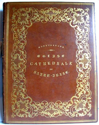 RICARD de MONTFERRAND, Auguste.- Église cathédrale de Saint-Isaac. Description architecturale, pittoresque et historique de ce monument. Ouvrage dédié à S.M. l'Empereur de toutes les Russies. Saint-Petersbourg, F. Bellizard, 1845. Grand et large in-f° : faux titre, titre, [2]-88-[2] pp., ill. in et hors texte (qqs rousseurs passim). Rel. de l'époque : plein veau naturel, plats cernés d'un large décor de fleurons rocaille dorés (cernant le titre doré sur le plat sup., avec double cadre rocaille sur le plat inf.), dos à nerfs sertis de filets à froid et caissons à fleurons rocaille dorés, coupes fleuronnées dorées, gardes de reps moiré blanc cassé serties de veau naturel et roulette dorée, gardes volantes de même reps, tranches dorées (qqs taches, lég. frott. sinon bon aspect).