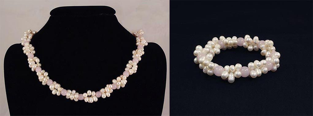 RICE PEARL & ROSE QUARTZ 515.60CTW NECKLACE & BRACELET **|**|** 18 INCHES LONG RICE PEARL WITH 8MM ROSE QUARTZ ROUND BEADS NECKLACE AND AN ELASTIC BRACELET SET ; MSRP: $200