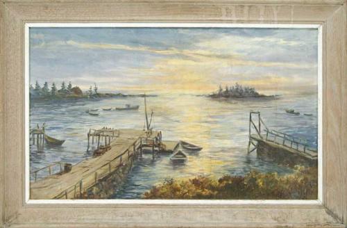 RICHARD C. HASENFUS (American, 20th Century) TRANQUILITY BAY. Oil on canvas Maine harbor scene shows several wooden docks on rock pilings with moored dinghies and lobster boats. The rising sun casts yellow and orange reflection on water. Signed lower right "R. Hasenfus 1964". Housed in a white washed oak frame with white liner. Maine Shore Art Galleries label to reverse. SIZE: 18" x 30". CONDITION: Shows water drip marks which should be easily cleaned. Otherwise good. 9-28227
