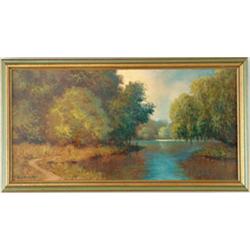 RICHARD D. ENRIGHT (American, 20th Century) A STREAMSIDE PATH. Oil on canvas summer scene shows winding body of water with path beside. Signed lower left “R. Enright”. Housed in a green and gilt molded wood frame. SIZE: 15” x 30”. CONDITION: Very good. 9-25686