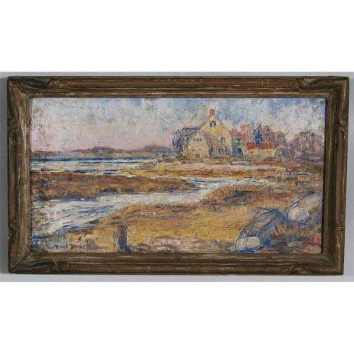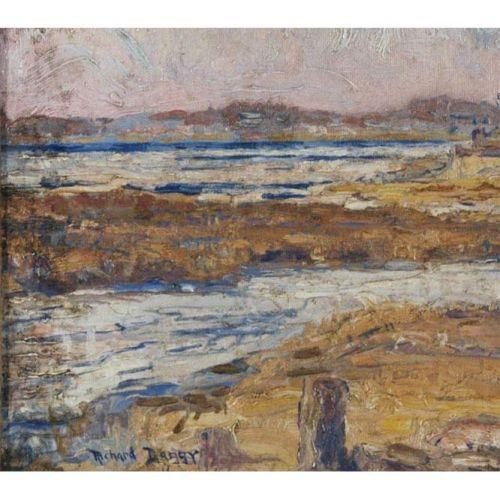 RICHARD DAGGY 10"x18" oil on masonite titled verso "Compo Beach" CONDITION REPORT: excellent, a bit dirty- no damage or restoration. PACKING AND SHIPPING: offered by Fairfield Auction to points within Continental U.S.A. and excluding insurance (which will be required and added) $40.