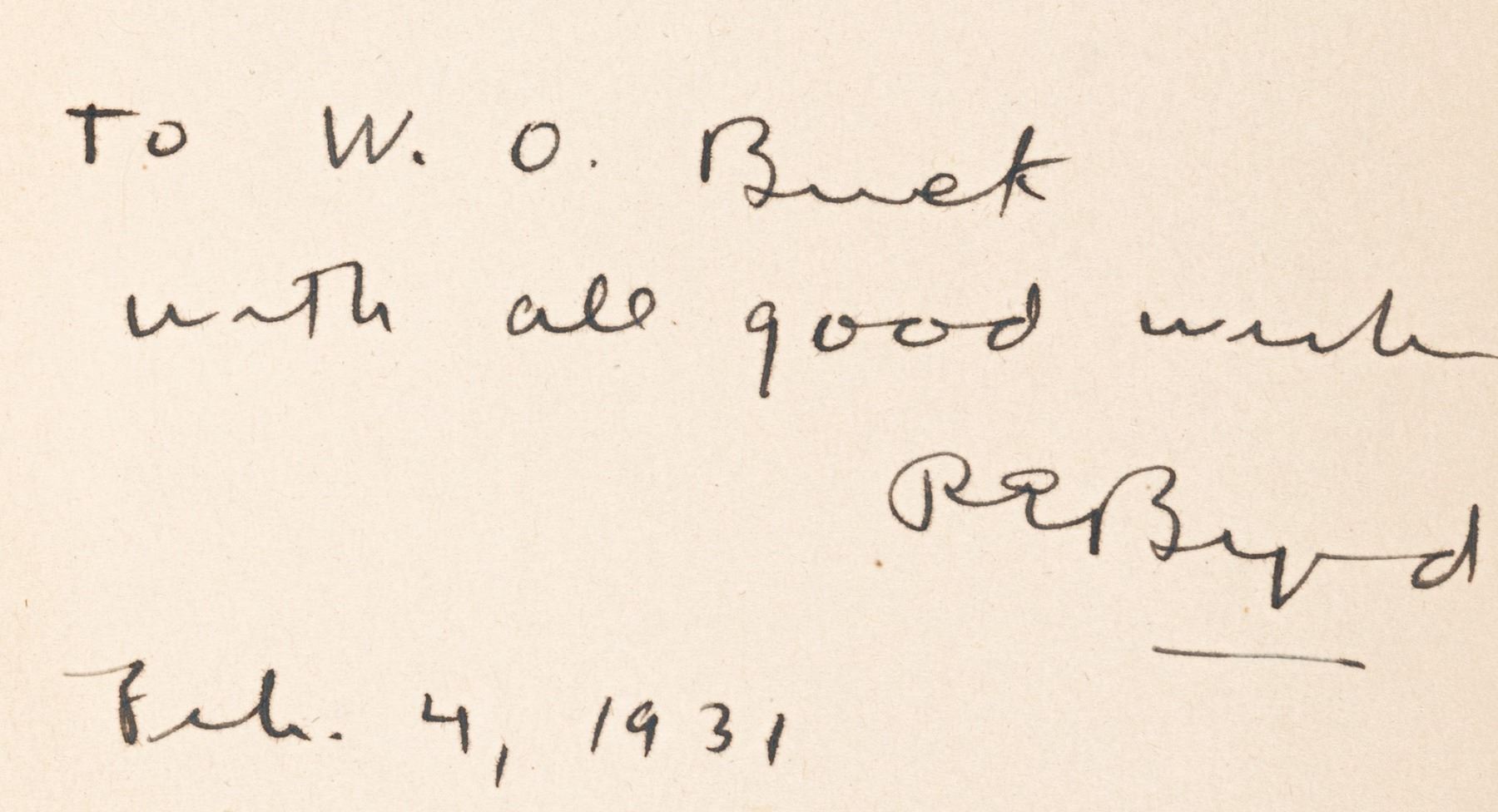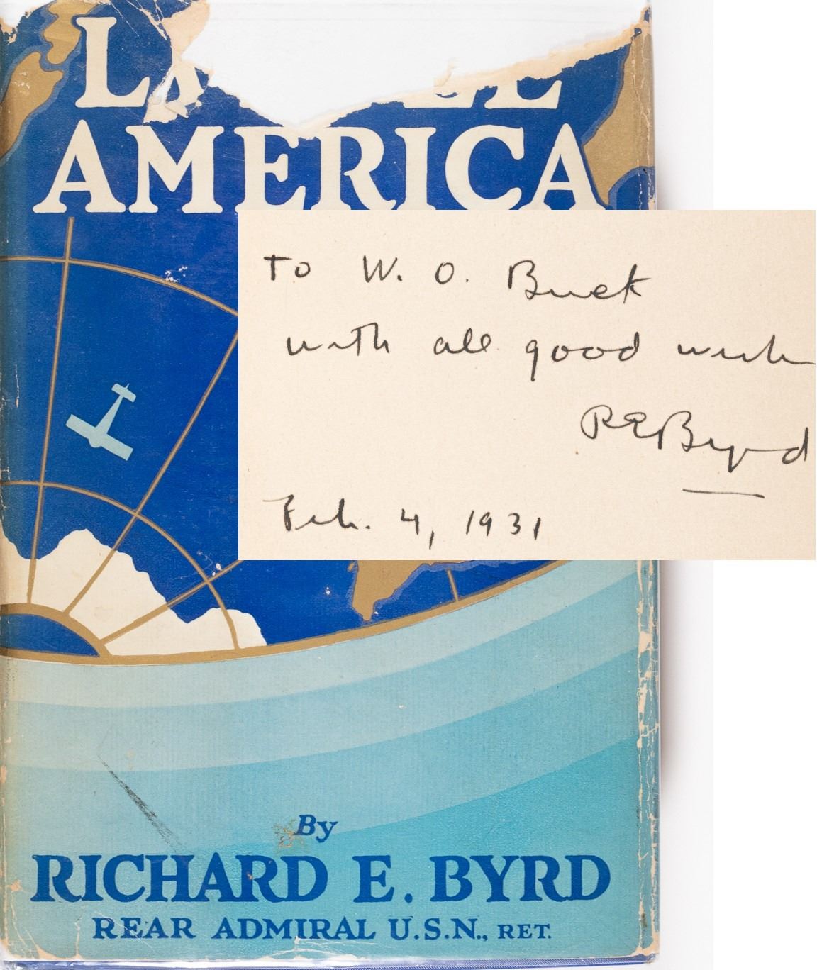 (1888-1957) American naval officer, explorer, and MOH recipient. 'Little America: Aerial Exploration in the Antarctic - The Flight to the South Pole'. Written by Richard Evelyn Byrd, G.P. Putnam's Sons, 1930, 422 pages, hardcover, 9.5 x 6.5 inches, signed by Byrd on half-title page, 'To W.O. Buck - With all good wishes - R.E. Byrd' and dated February 4th, 1931. Book has 74 illustrations and maps. Book cover has loss at top edge, minor abrasions, and minor toning on pages.