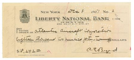 (1888 - 1957) American aviator and explorer, first to fly over the South Pole and established the base "Little America". Partly-printed D.S. 1p. oblong 12mo., New York, Dec. 8, 1927, a check drawn on the Liberty National Bank ordering a payment of $18,242.00 to the Atlantic Aircraft Corporation. Boldly engrossed and signed the year of Byrd's transatlantic flight. Punch cancels do not affect signature, very good condition. This payment may have been for parts used by Byrd to construct an aircraft in an attempt to win the Orteig Prize in 1927 for making the first nonstop flight between the U.S. and France. Byrd's Fokker Trimotor airplane, America, crashed, severely injuring co-pilot Floyd Bennett and slightly injuring Byrd. As the plane was being repaired, Charles Lindbergh won the prize.
