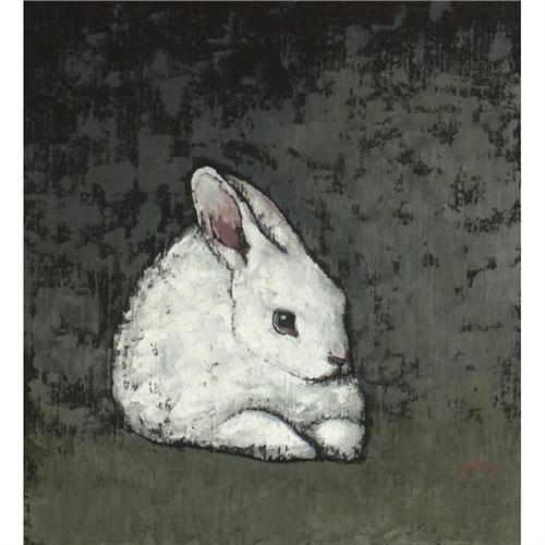 OIL PAINTING: Richard Charles Gilkey (WA, 1925-1997) Titled: Rabbit, 1969, image depicting a single white rabbit, signed in the lower right corner, presented in a worn frame with white linen mat. Image: 23.5'' x 21.5'' Frame: 28'' x 26''