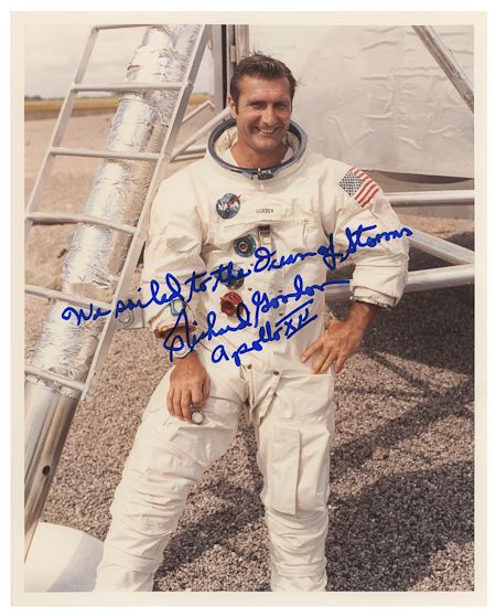 (b. 1929) American astronaut who flew on the Gemini 11 and Apollo 12 missions. Fine S.P. 8" x 10" color, a great shot showing Gordon in flight suit standing before an aircraft, boldly signed in blue marker: "We sailed to the Ocean of Storms Richard Gordon Apollo XII". Along with WALTER SCHIRRA (b. 1923) American astronaut, the only astronaut to fly all three types of manned spacecraft. Fine S.P. 10" x 8" color, a head and shoulders shot of Schirra before a backdrop of a rocket. Boldly signed and fine. Two pieces.
