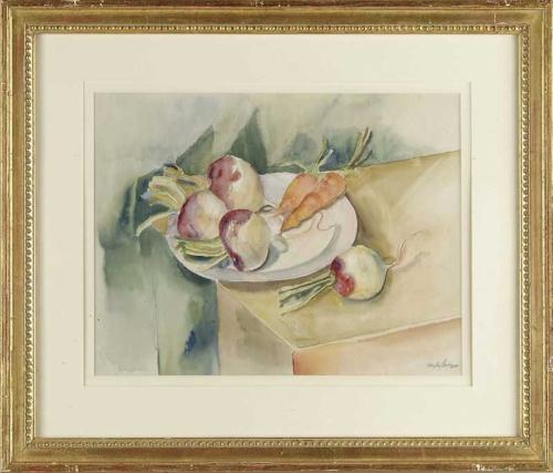 RICHARD HAYLEY LEVER (American, 1876-1958) STILL LIFE OF VEGETABLES. Watercolor scene shows a white plate having three turnips and two carrots atop with another turnip beside. All on a counter with green background. Signed in pencil lower right. Housed in a fine gilt decorated wood frame with double matte. SIGHT SIZE: 13-1/2" x 17-3/4". CONDITION: Very good. 9-27329