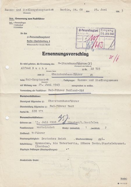 (1897 - 1952) SS-Obergruppenführer and chief of the SS Office of Race and Resettlement. As a war criminal he was found guilty of kidnapping of alien children, forcible abortions, taking away infants of Eastern workers, forced evacuation and resettlement, utilization of enemy nationals as slave labor, euthanasia, and a host of other charges. Turned over to the Poles, who quickly executed him. D.S., 2pp large 4to., Race and Resettlement Office, Berlin, June 23, 1943, a recommendation for a promotion for SS-Sturmbannfuhrer Alfred Buchs who had worked at the SS R.U.S. offices in central and southern Russia. Docketed, file holes, overall very good.