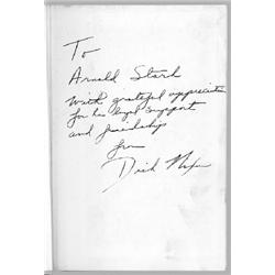 <b>295. RICHARD M. NIXON </b>Scarce signed book, <i>Nixon's Six Crises</i>, Doubleday & Co., New York, 1962, first edition, inscribed on the front flyleaf: "<i>To Arnold Stark with grateful appreciation for his loyal support and friendship, from Dick Nixon</i>". Lower-right corner of cover and first two pages very lightly dampstained, covers a bit worn - nonetheless quite presentable and rarely found authentically-signed.<b>$200-300</b>