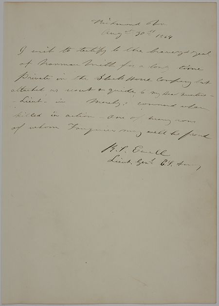 (1817 - 1872) Confederate lieutenant general who fought in the war from Bull Run to Appomattox, he lost a leg at Groveton and was strapped in his saddle to lead his men into Pennsylvania and at Gettysburg. Especially rare war-date A.D.S. "R. S. Ewell Lieut. Genl. C. S. Army", 1p. 4to., Richmond, Aug. 30, 1864, in full: "I wish to testify to the bravery and zeal of Norman Smith for a long time Private in the Black Horse company but attached as Scout & Guide to my Head Quarters - Lieut. in Mosby's command when killed in action - one of many sons of whom Fauquier may well be proud...". Very fine condition and ideal for presentation. This document was removed from an album originally owned by Austin Smith, son of Virginia governor and C.S.A. Major General William "Extra Billy" Smith. This book was partly filled with autographs by Austin, but following his death in action at Gaines Mill, his family circulated the book to be signed by prominent people in his memory. Here, Ewell remarks on Norman Smith, likely a brother. The book Mosby's Rangers makes dozens of references to Norman Smith throughout.