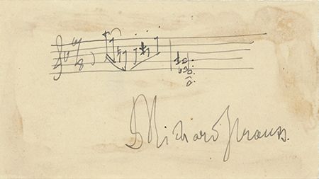 (1864 - 1949) German composer of fifteen operas, including Salome, Der Rosenkavalier and Also sprach Zarathustra. A.M.Q.S., one measure of an unidentified composition boldly penned on a small card and signed beneath. Moderate showthrough from mounting to edges, clear of signature and just touching the quote, overall good.