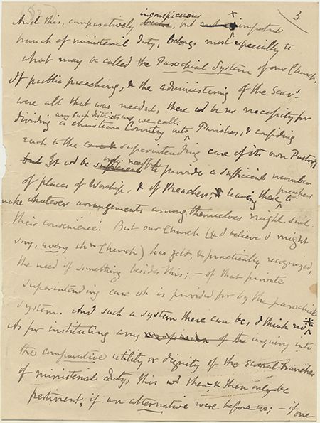 (1787-1863) English rhetorician, logician, economist, and theologian who also served as the Church of Ireland Archbishop of Dublin. A.Ms. (unsigned) 1p. 4to., [n.p., n.d.], a sheet from a sermon, in part: "...And this, comparatively inconspicuous but important branch of ministerial duty, belongs, most especially to what may be called the Parochial System of our Church. If public preaching, & the administering of the Sacrd were all that was needed, there wd be no necessity for dividing any such district as we call a Christian country into Parishes...But our Church...has felt...the need of something besides this..." and more. Tipped to an album page with docket in another hand indicating that this was one of Whateley's last sermons delivered, very good.