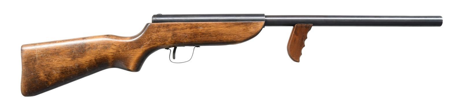 Cal. 12 GA. S# 9826. Bbl 24". Highly unusual R-5 slam fire shotgun manufactured by Richardson Industries of New Haven, CT. Top of receiver is stamped w/ the manufacturer information, model designation, and caliber designation, but is otherwise devoid of any stampings. Blued finish w/ solid wood furniture. CONDITION: Metal components retain the majority of their original factory blue finish, exhibiting areas of mild wear and some light thinning, w/ with mild spots of surface oxidation overall. Dark bore with pitting throughout. Wood furniture exhibits some wear to the varnish and some scattered marks from handling and storage, but is otherwise sturdy and serviceable. (23-2120/MLW). CURIO. $400-600.