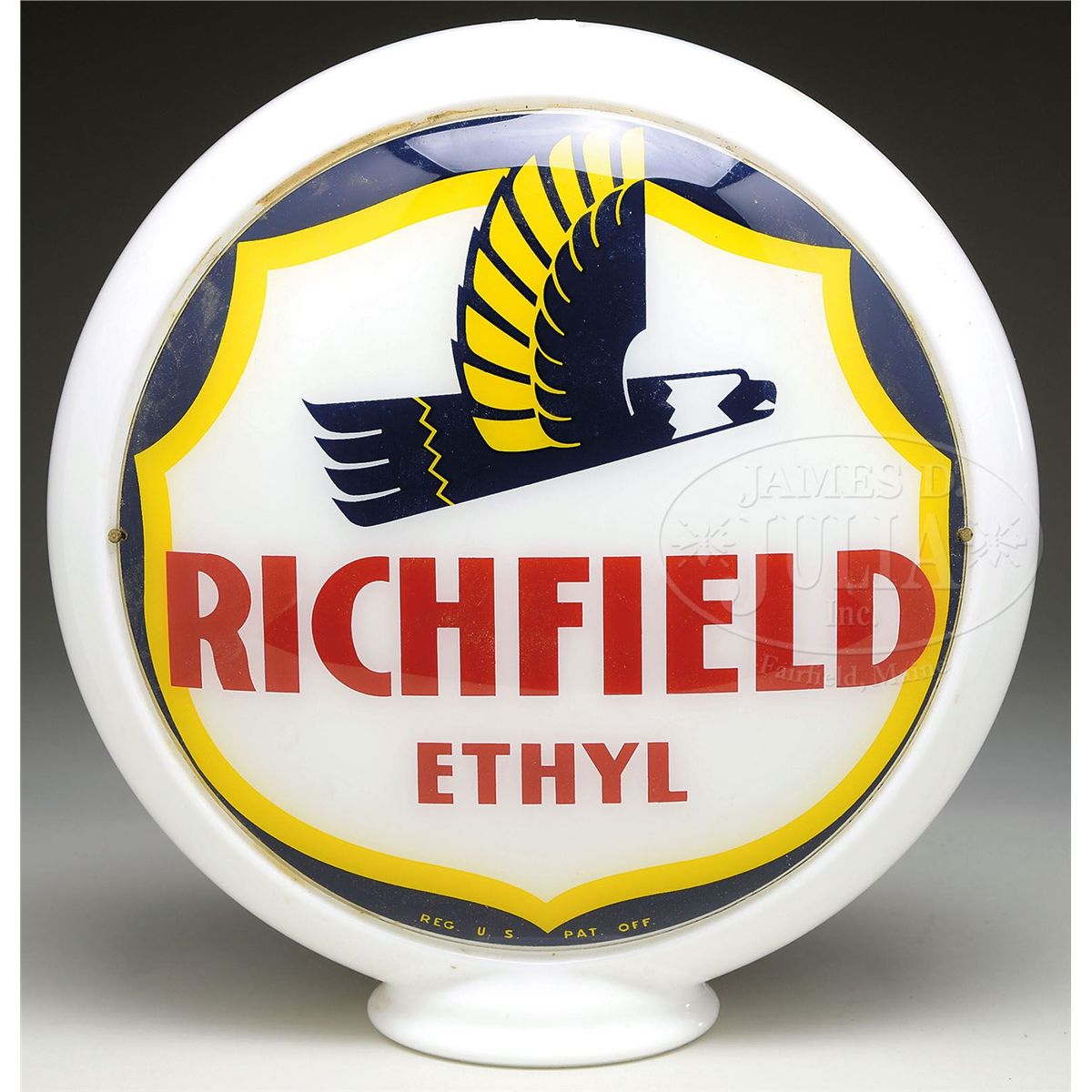 Three-piece globe with two Richfield Ethyl lenses in a milkglass body, circa 1953. Appears to be in original cardboard shipping box. SIZE: 16" dia. CONDITION: Near excellent and possibly new old stock. 1-13200