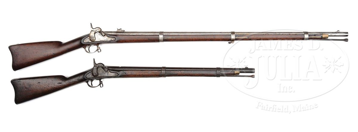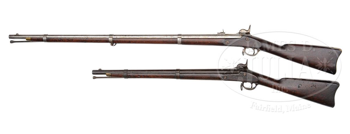 Cal. 58. You are bidding on two 1863 dated Confederate Richmond Arms, both with orig 1863 dated locks. Musket has a very attractive look with orig brass buttplate and nosecap. Carbine is a bit of a relic though still solid and sound but metal pitted overall. PROVENANCE: Dr. Andrew Kelley Collection. CONDITION: Musket conforms to other rifle muskets with 40" bbl. 3 iron bands, correct brass buttplate and nosecap. Metal overall is gray with areas of staining and pitting. Lock markings are well struck and discernible, as can be seen in photos. "VP" proof on bbl and "U"s on bands are not Richmond. Stock overall sound and solid with old cleaning and numerous small dings, dents and scratches. Musket was not taken apart to ascertain origin of stock and brass buttplate is well fitted. Gun is mechanically functioning with discernible rifling. Carbine is sound and solid, missing sling swivel on front band and rear swivel which was mounted on wood. Front sight is replaced. Bore is smooth and measures about 64 cal. Buttplace has "US" surcharge. Front band and ramrod appear replaced, as their surfaces are not as near as rusted and pitting as the orig iron to this gun. Stock is very weathered and worn. Gun will not hold cock but mainspring is strong. 4-48859, 4-48862 JS21
