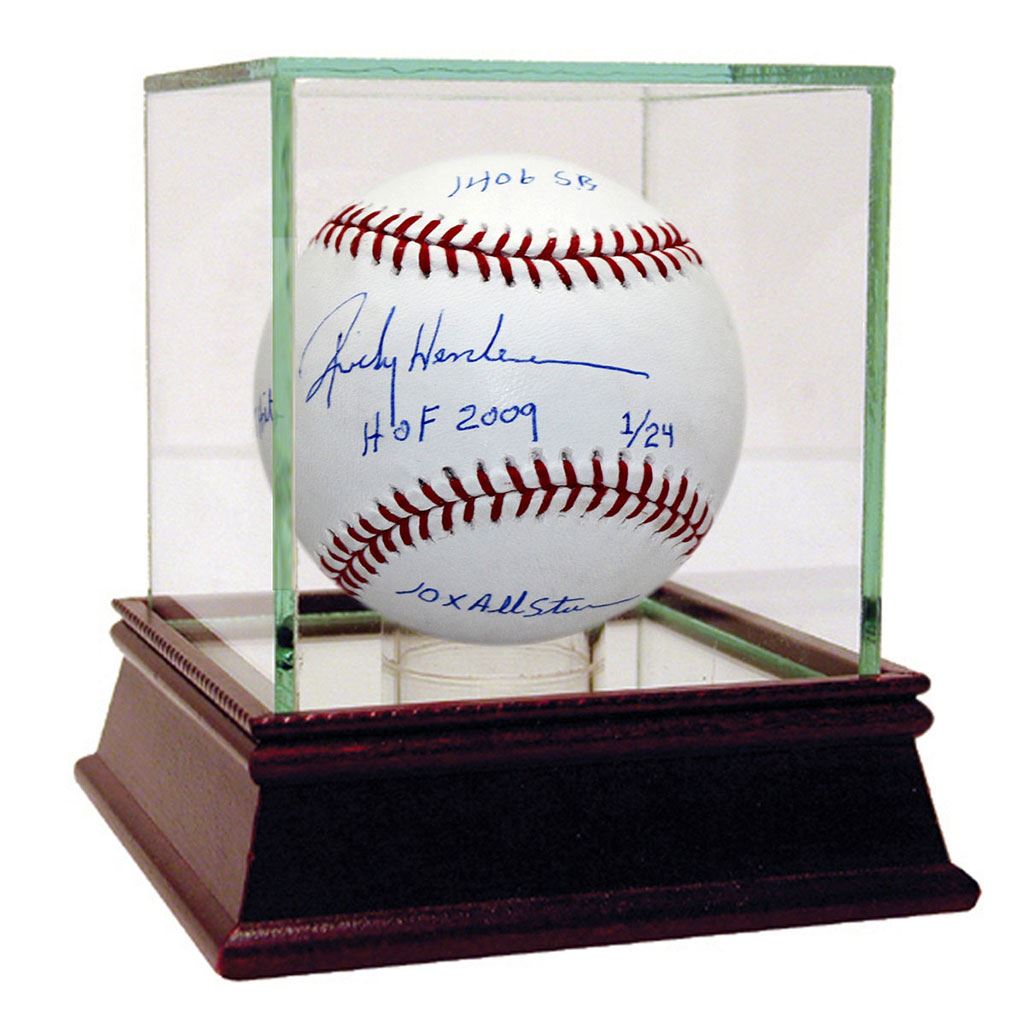 RICKEY HENDERSON SIGNED STAT MLB BASEBALL WITH 5 INSCRI **|**|** Rickey Henderson personally hand-signed this MLB Baseball and inscribed it "HOF 2009,1406 SB,3055 Hits,2295 Runs, & 10x All-Star." Henderson played for twenty-five seasons breaking many Major League Baseball records. Henderson holds the record for most steals in a season with 130 in 1982, he also has the most Stolen Bases all-time with 1406, he scored 2295 Runs which is the most all-time. In 2009 Henderson was voted into the MLB Hall of Fame. This incredible piece is guaranteed by MLB Authentication