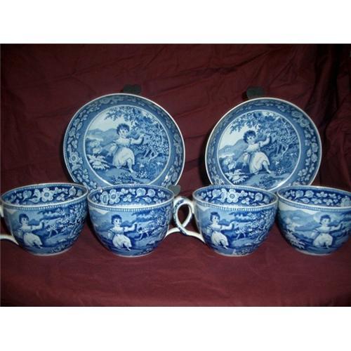 SET OF 4 RIDGWAY SAUSER'S BLUE & WHITE DEPICTS A LITLE GIRL Ca.18Th condition a ship on one of the saucers