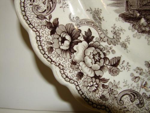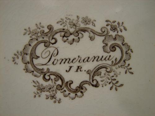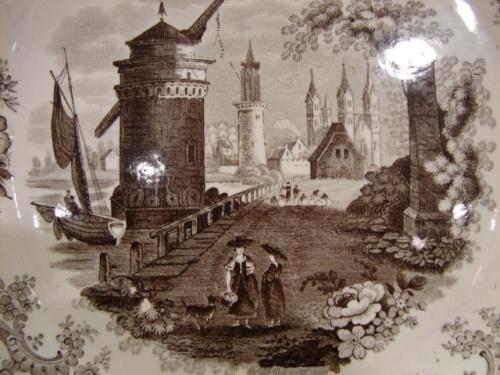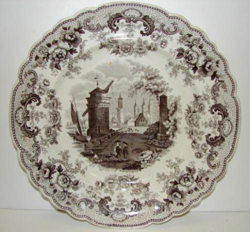 RIDGWAY POTTERY BROWN & WHITE TRANSFERWARE PLATE. Decorated with scene along river with buildings and people and floral decorated border. Marked on reverse “Pomerania/J.R.” Shows a few small chips along bottom rim. 10.25” Dia.
