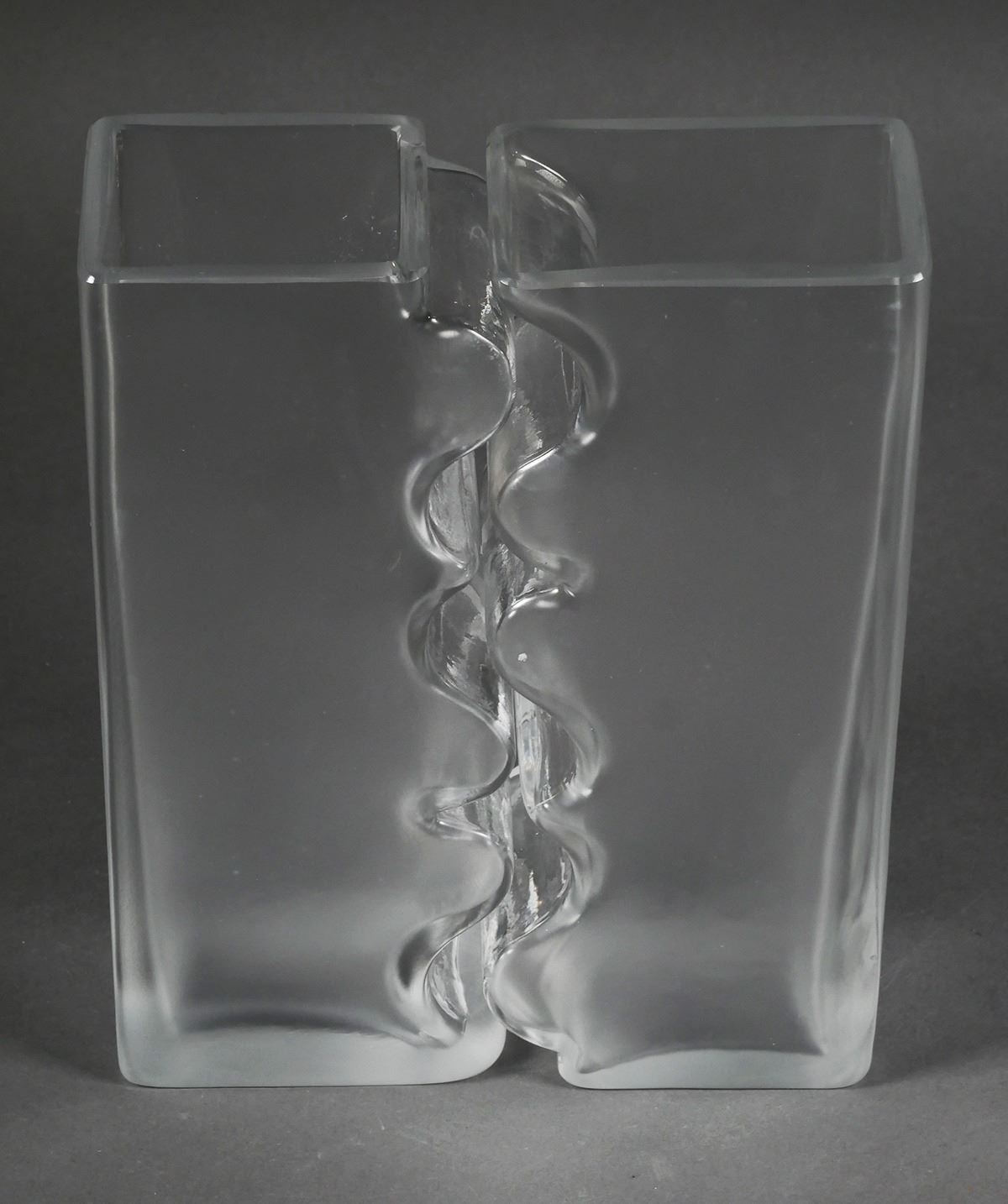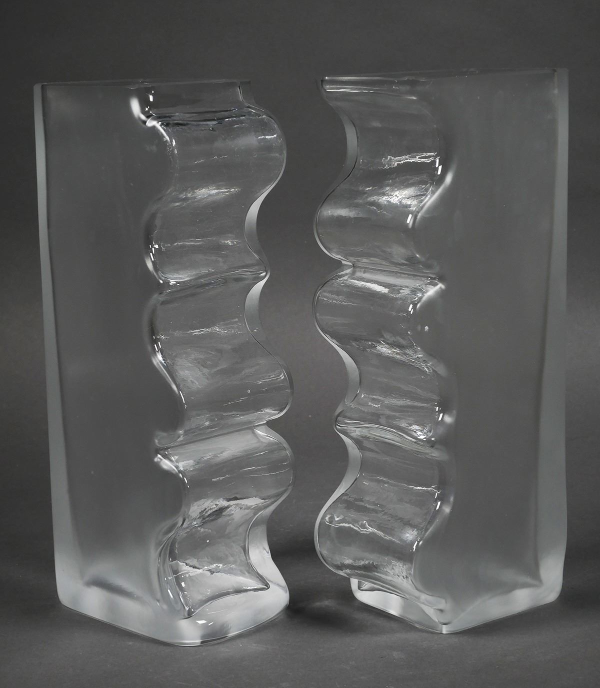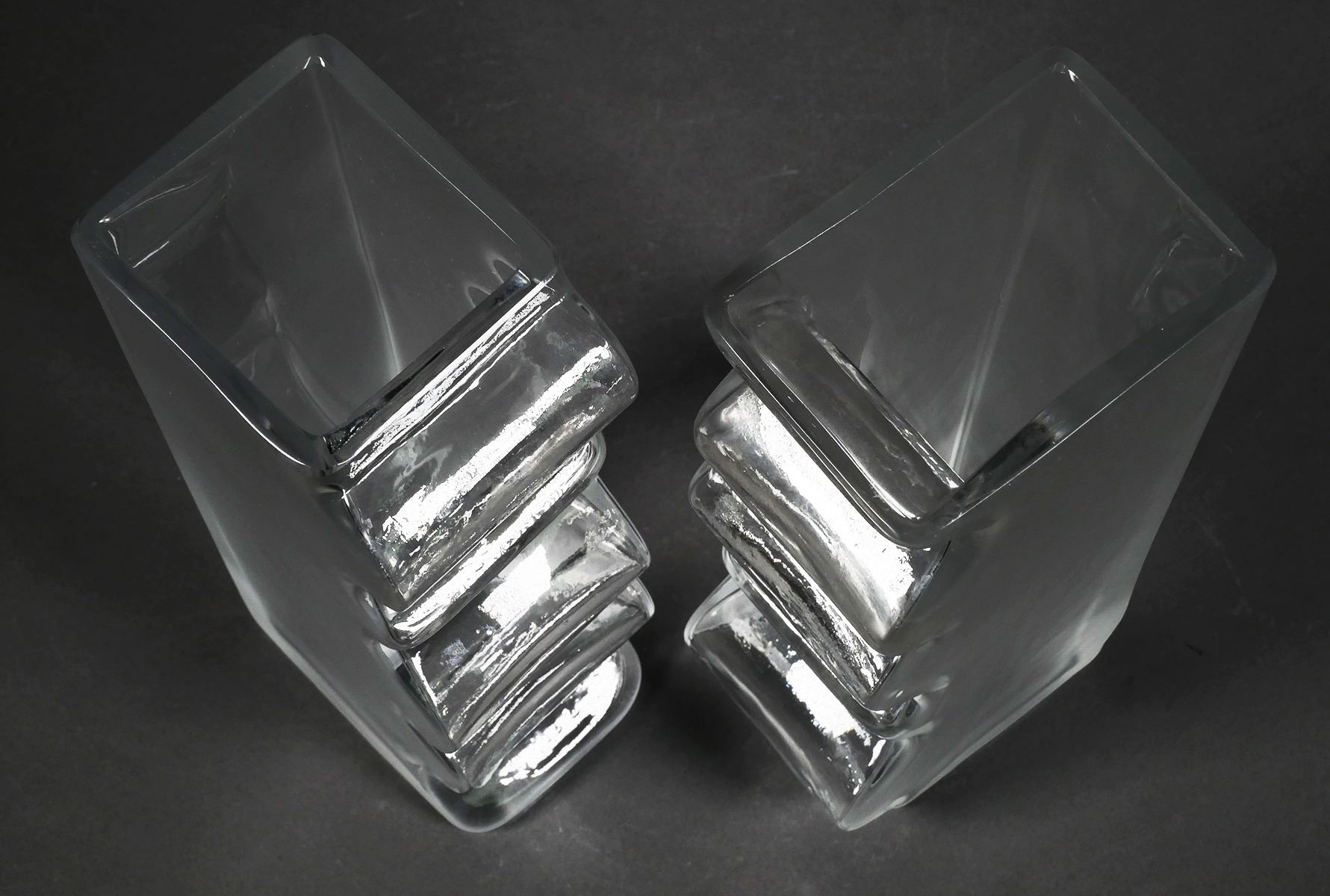 Pair of Riedel vases that fit together when put side by side. When together they form a rectangle which measures 10" x 7 1/4". Clear crystal with CJR in a square mark under base for Claus Josef Riedel. Circa 1970s. Fine condition with no visible damage or repairs.