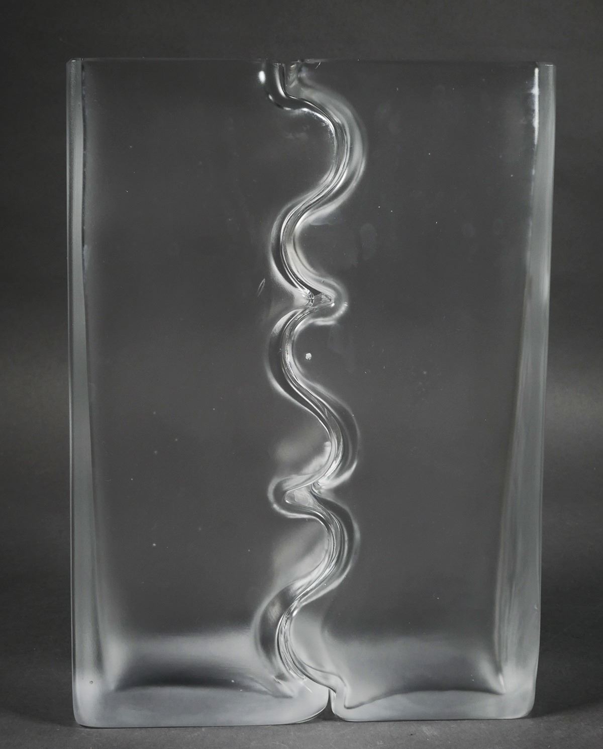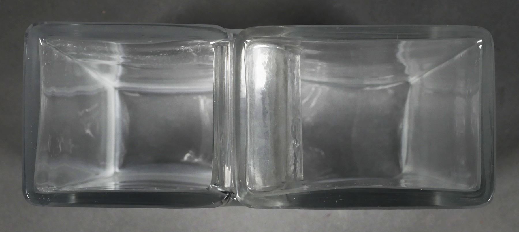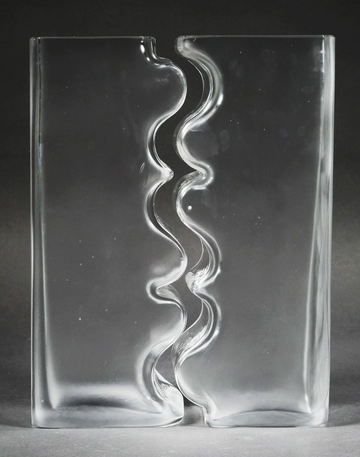 Pair of Riedel vases that fit together when put side by side. When together they form a rectangle which measures 10" x 7 1/4". Clear crystal with CJR in a square mark under base for Claus Josef Riedel. Circa 1970s. Fine condition with no visible damage or repairs.