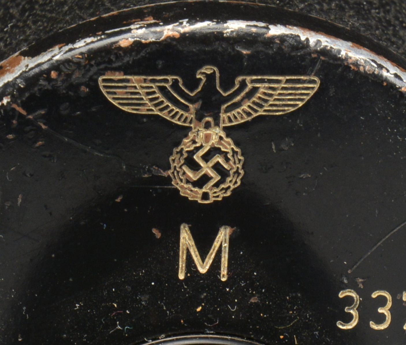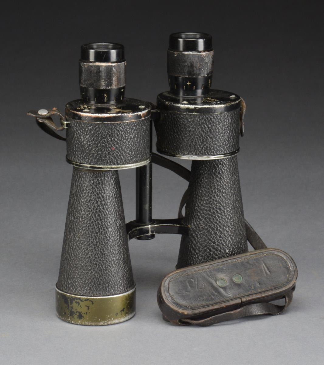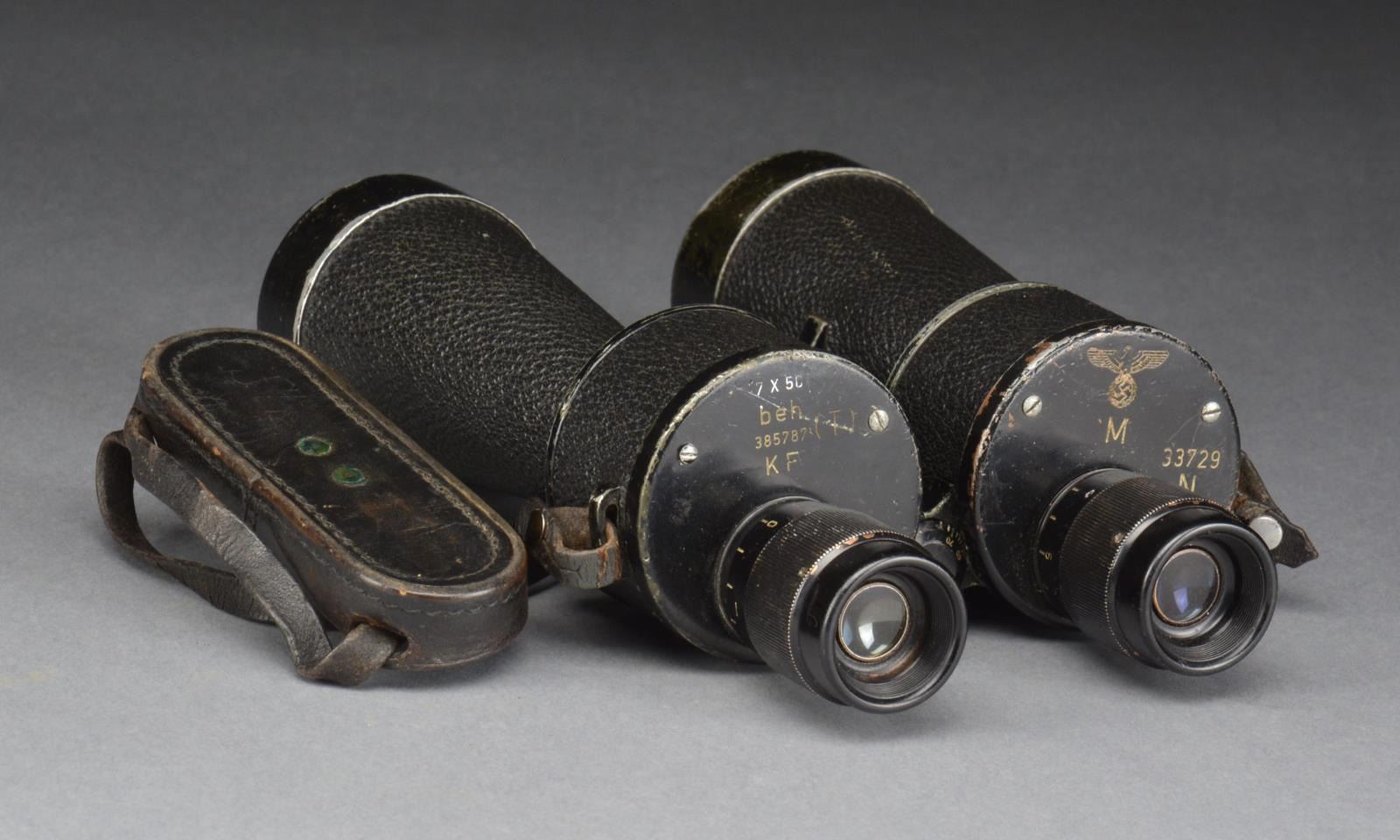 KRIEGSMARINE EAGLE M NORDSEEFLOTTE (NORTH SEA FLEET) PROPERTY MARKED BINOCULARS. S#385787(T). Overall length 8 1/2". Utilized by German U Boats and other naval vessels during WWII. Leather lanyard w/ integral lens covers. Strong original markings. North Sea Fleet property mark "N/33729". CONDITION: overall very good w/ some black enamel finish loss on high edges & heavier finish loss on the objective lens rings. Very good optics. There is a small chip that is on an internal lens on the left tube that is hardly visible unless viewed through objective end. Very good leather lanyard. (02-14641/ZAL). $500-800.
