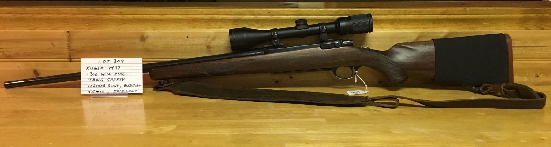RUGER, MODEL M77, 300 WIN MAG, S/N 71-88479, BOLT, WOOD EXCELLENT, BLUING EXCELLENT, BORE EXCELLENT, W/ LEATHER SLING, TANG SAFETY, BUSHNELL 3.5-10 SCOPE, AMMO POUCH, NOTE/ MADE IN THE 200TH YEAR OF AMERICAN LIBERTY