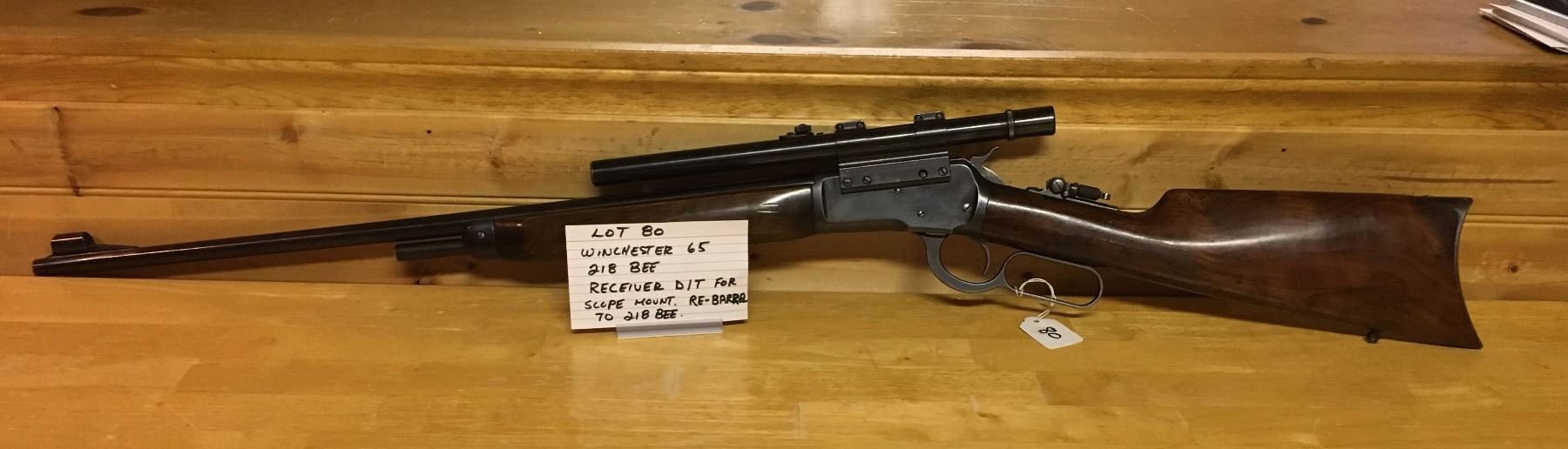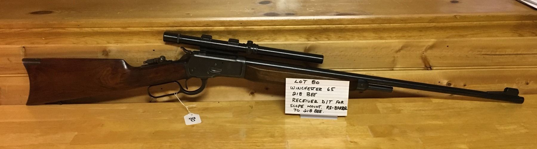WINCHESTER, MODEL 65, .218 BEE, S/N 541042, LEVER, W/WEAVER SCOPE, PEEP SIGHT, WOOD VERY GOOD, BLUING VERY GOOD, BORE, NOTE/RECEIVER D&T, ORIGINALLY .32-20, RE-BARRELED TO .218BEE