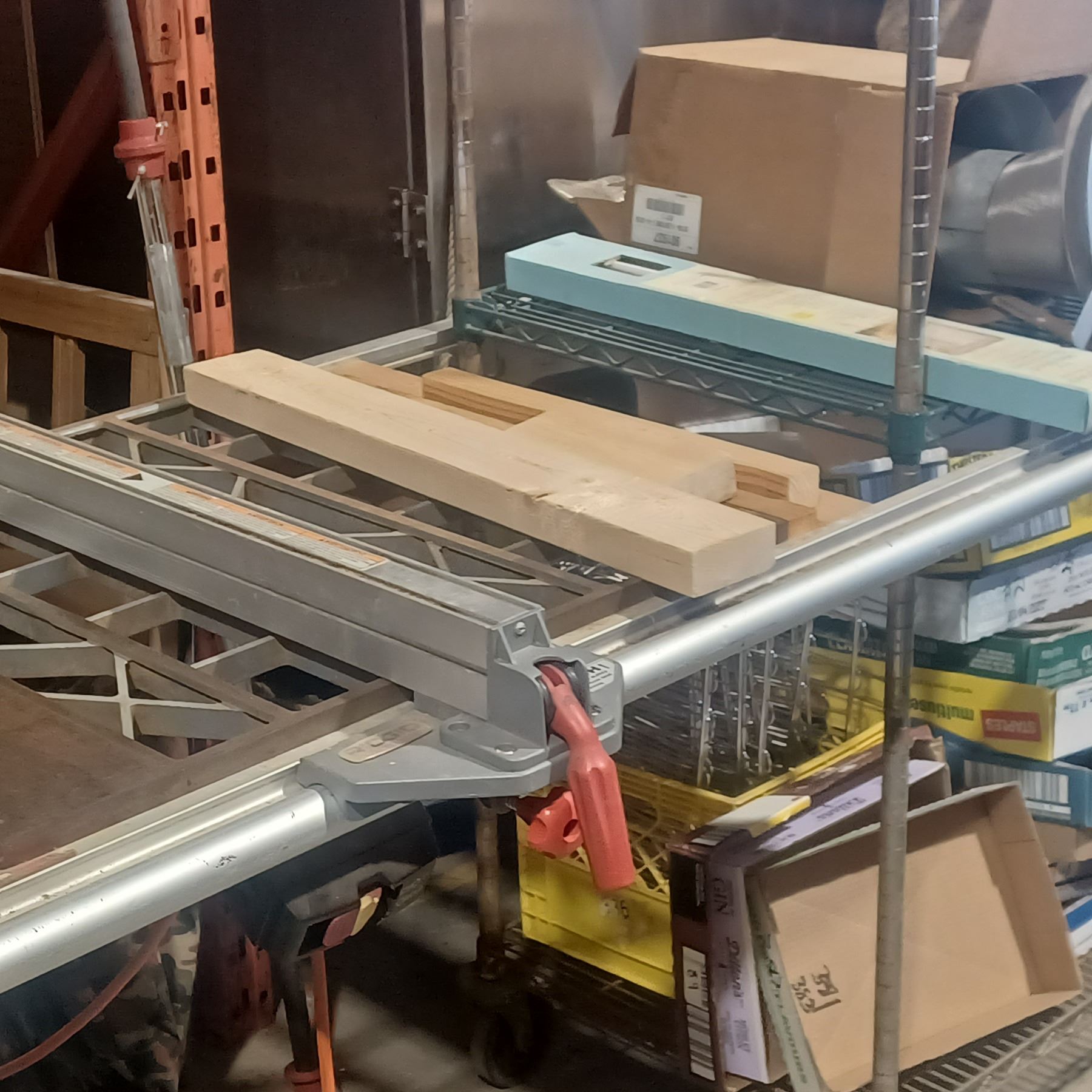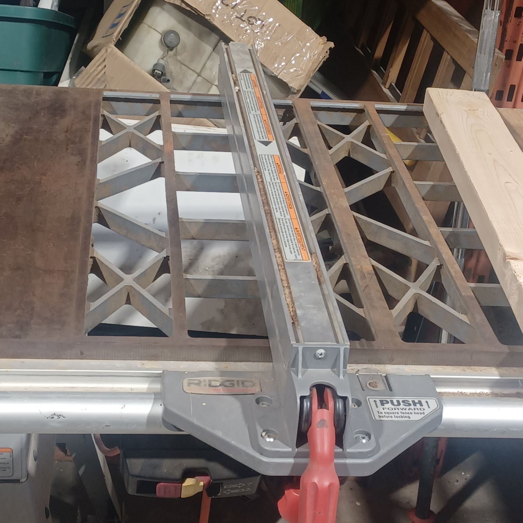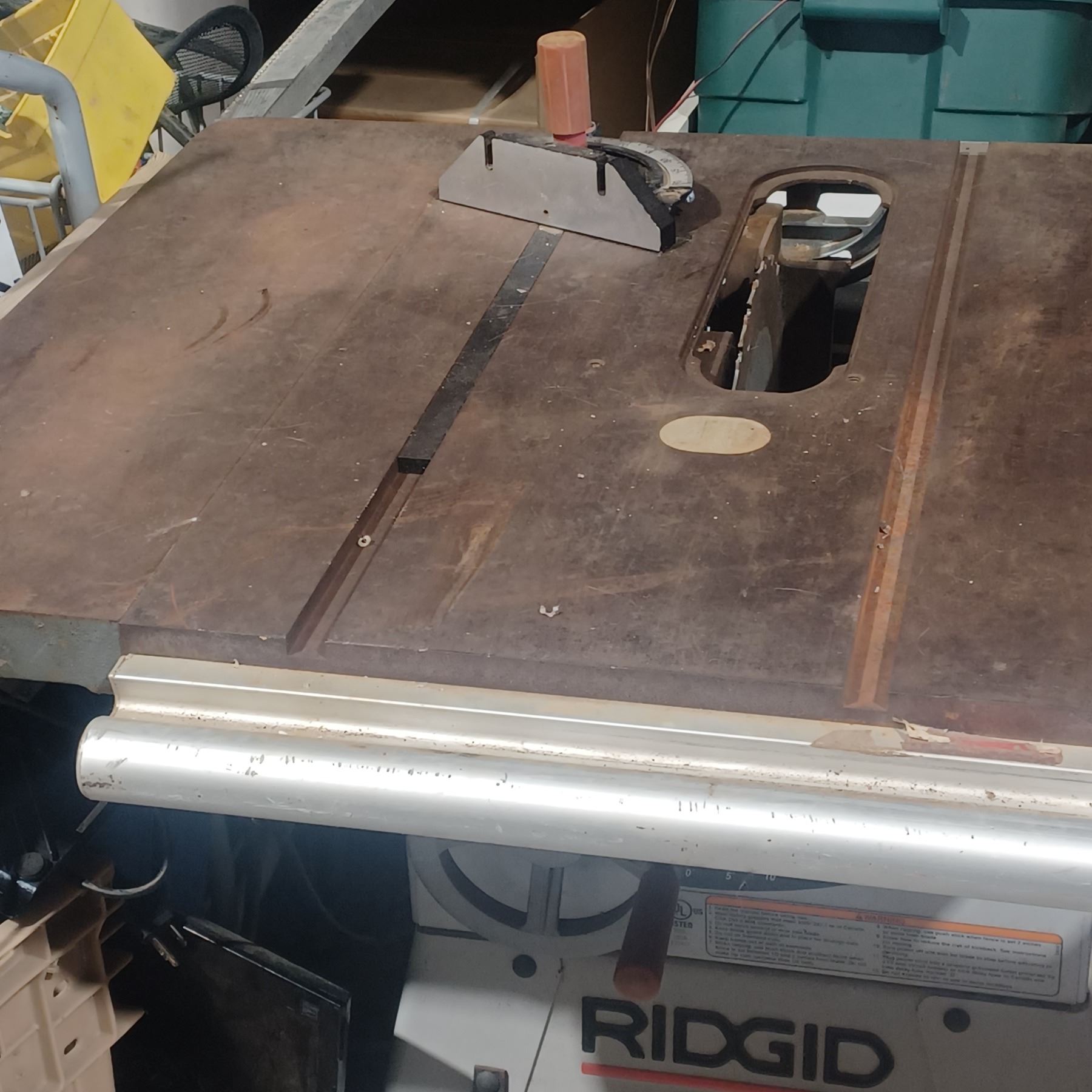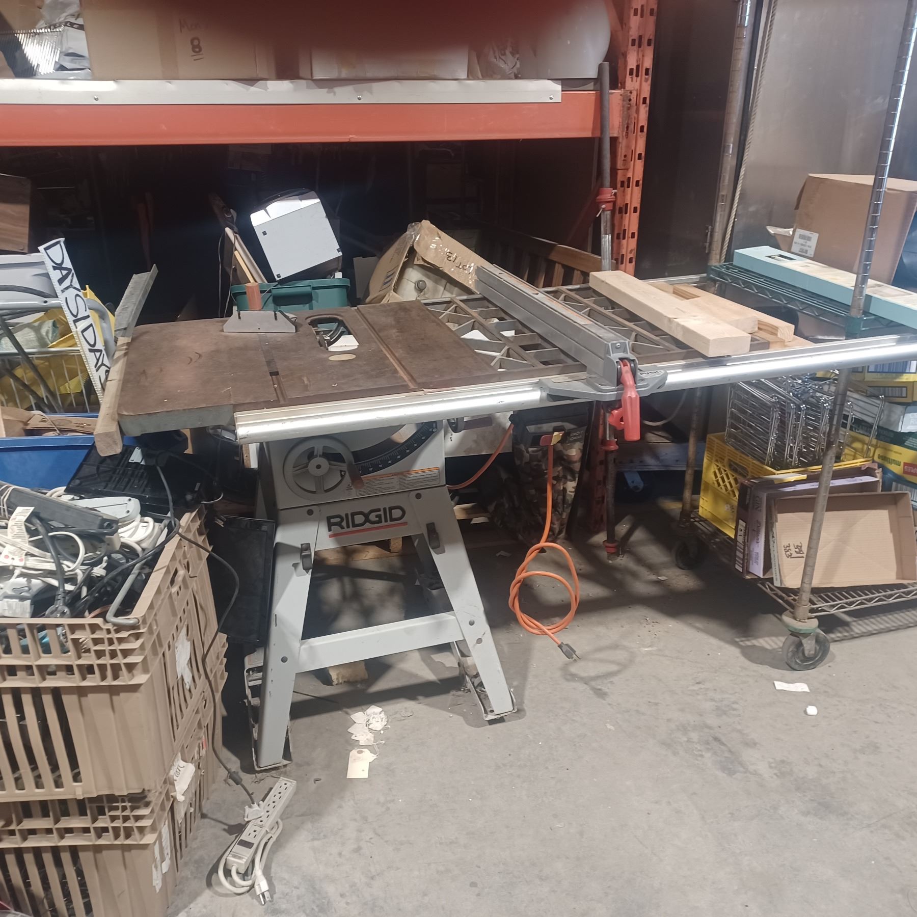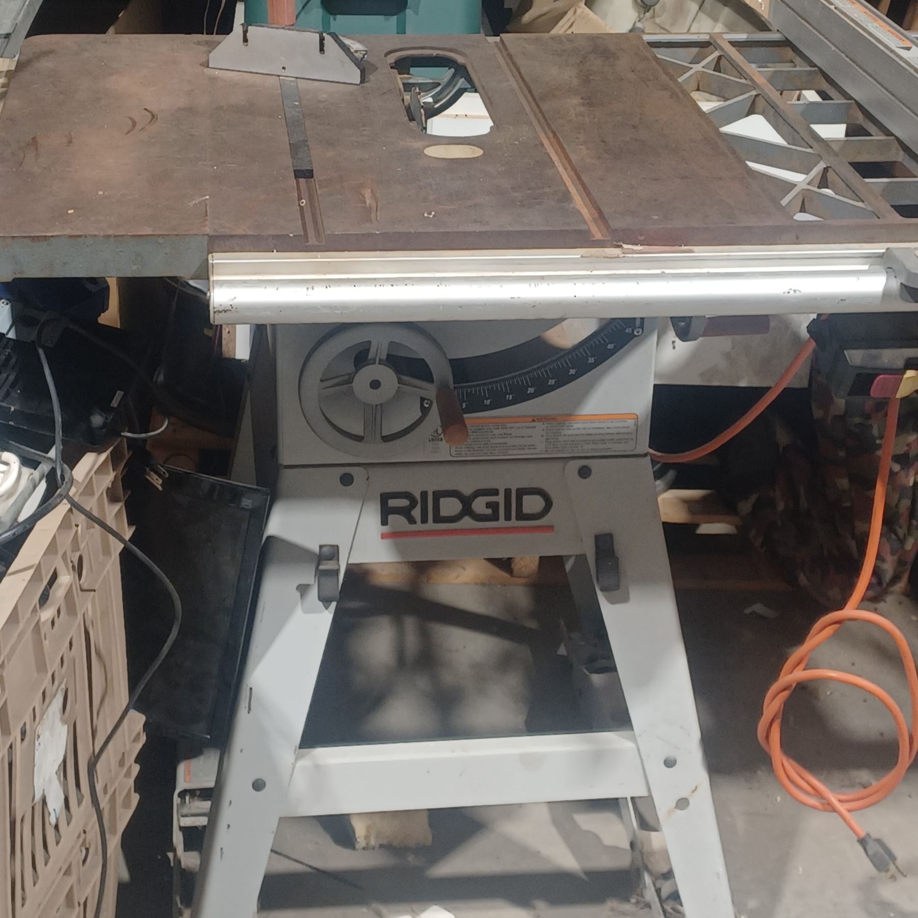 RIGID 10 INCH TABLE SAW C/W 48 INCH EXTENTION AND WHEELS ON TABLE