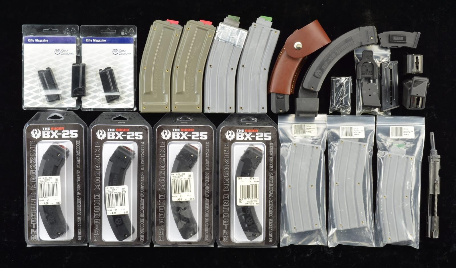 RUGER 10/22 (all factory 22 LR): 4 new in packaging BX-25 plus 1 in Hunter 27-9 leather belt carry holder. 1 BX-25-2 having dust cover on 1 BX-25. /1 black 10 rd. /1 clear 10 rd. LULA loader plus Unloader.
