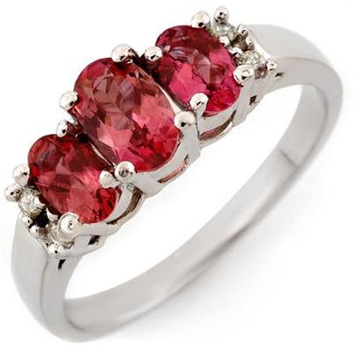 Precious beauty. This ring glows with three oval-shape, prong set pink tourmaline in a north-south direction. Added with round diamonds on each end for great look.<BR><BR>This October birthstone's name comes from the Sinhalese word 'turmali' and believed could
