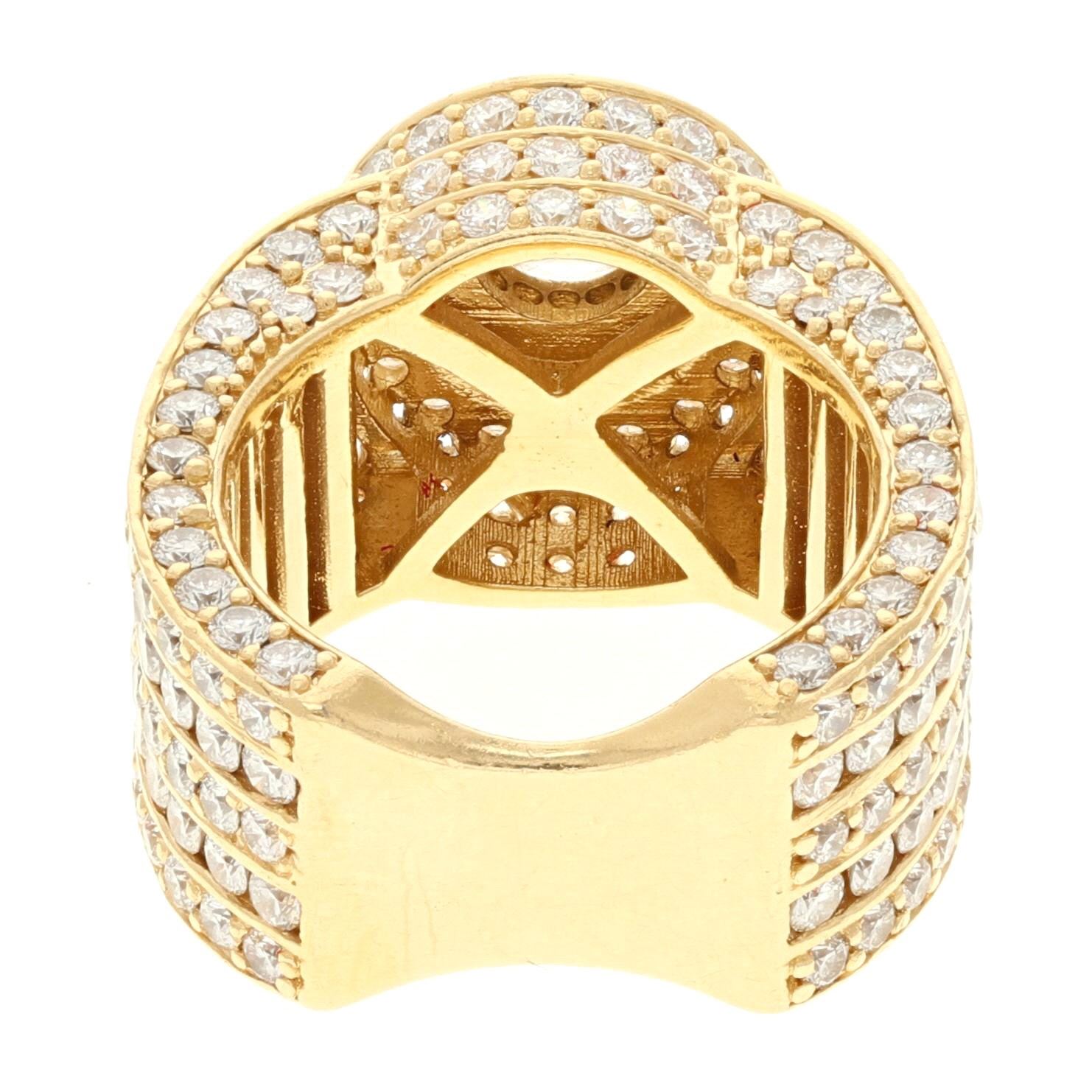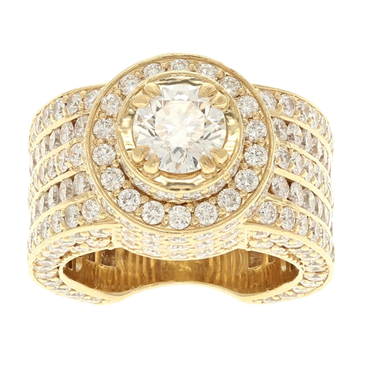 RING: [1] 14 karat yellow gold ring set with 253 round diamonds, approx. 6.33 carats total weight, G color, VS clarity; and a round brilliant cut diamond, 6.7mms in diameter, approx. 1.10 carats; I color, SI1 clarity; size 7 1/2; 22.48 grams