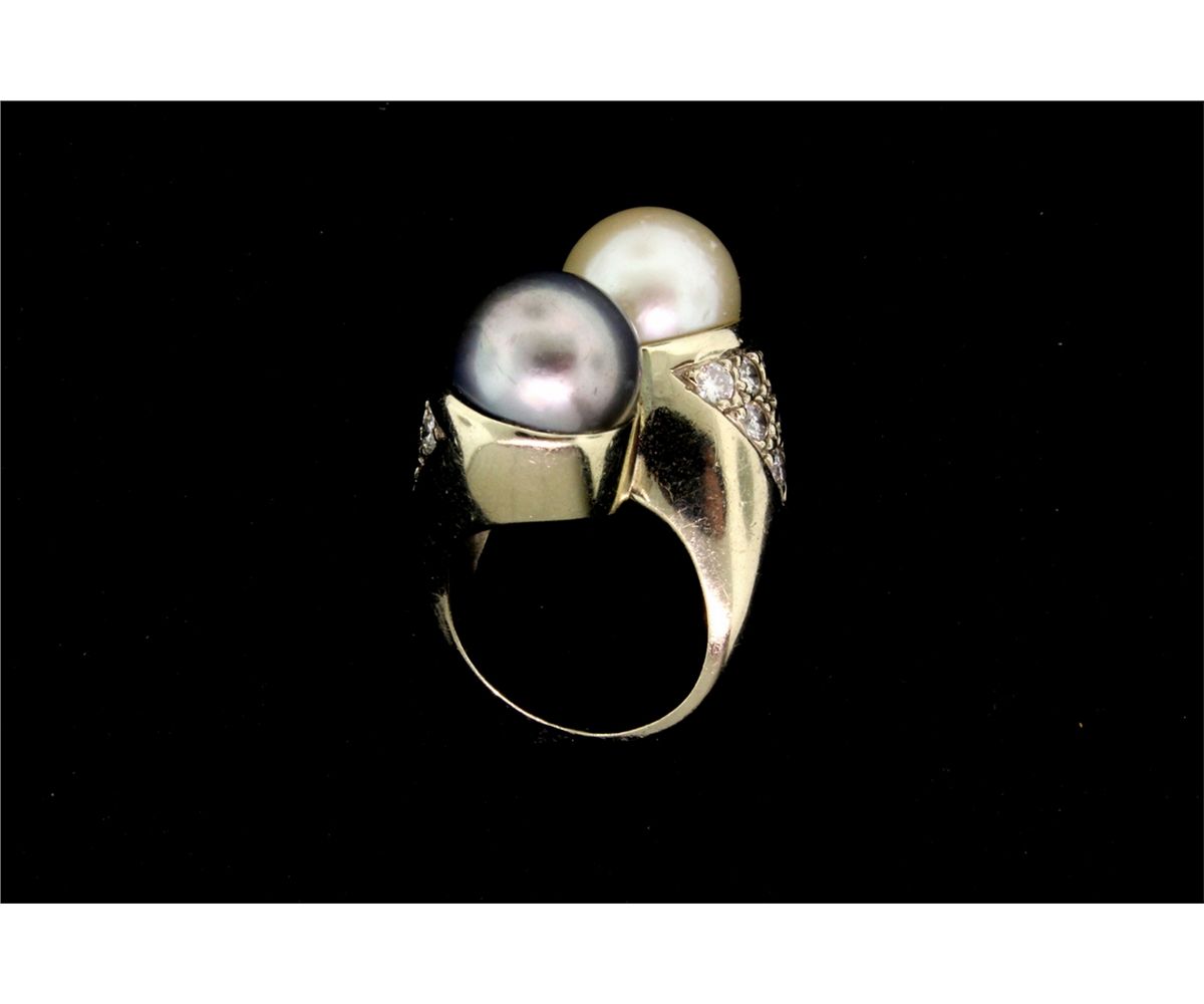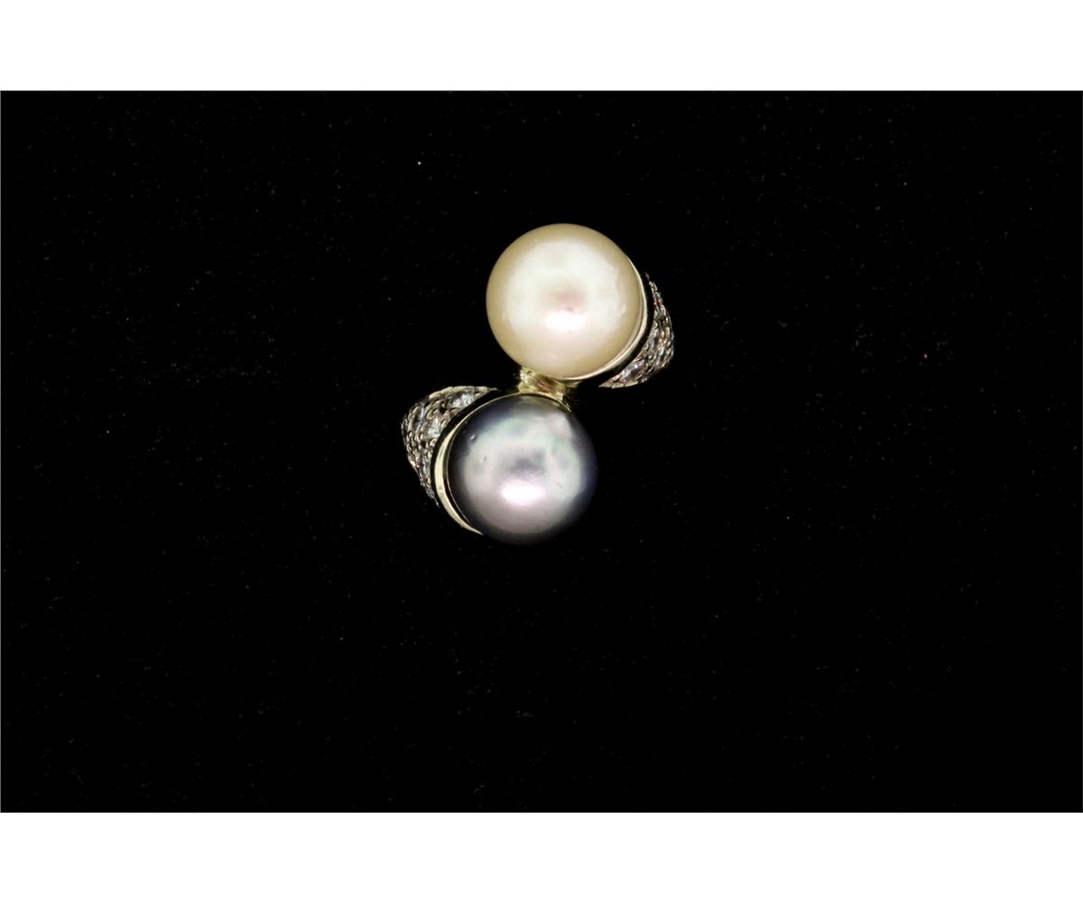 RING: [1] 14KWG bypass style ring set with 14 rd diamonds, approx. 0.95 cttw., fair / I/J, SI1-SI2; and a 12mm South Sea pearl and a 12.2mm gray Tahitian pearl; size 6; 24.3 grams.