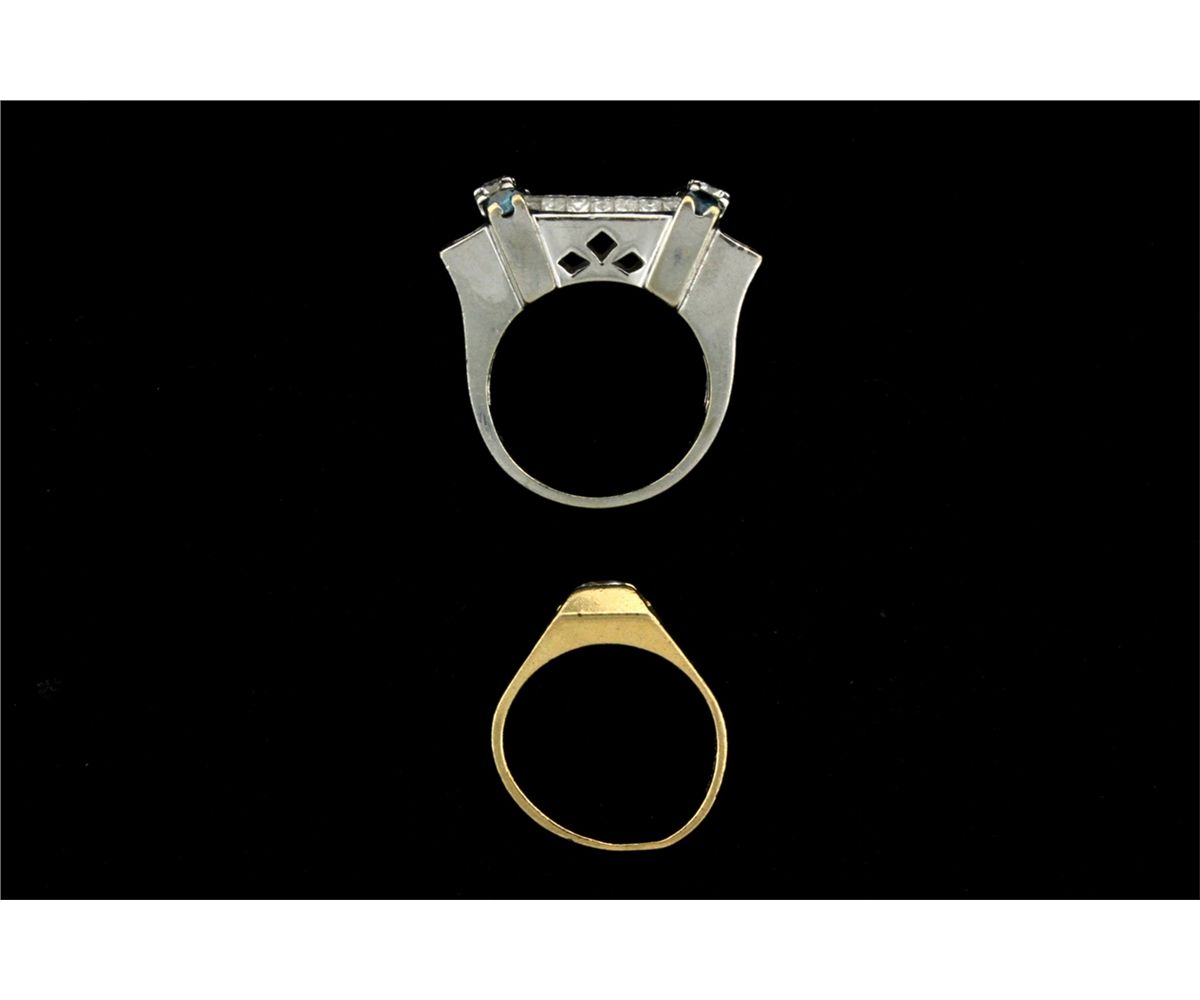 RING: [1] 14KYG ring set with 1 rd dia., 5.0 x approx. 2.9mms = 0.44 cts., K/L, I1; size 8 1/2; 6.8 grams RING: [1] 14KWG ring by JPM is set with 10 rd dia.s and 69 princess cut dia.s, TWA 5.94 cts, H/I and 6 rd are irradiated blue; SI1-I1; size 10; 18.1 grams