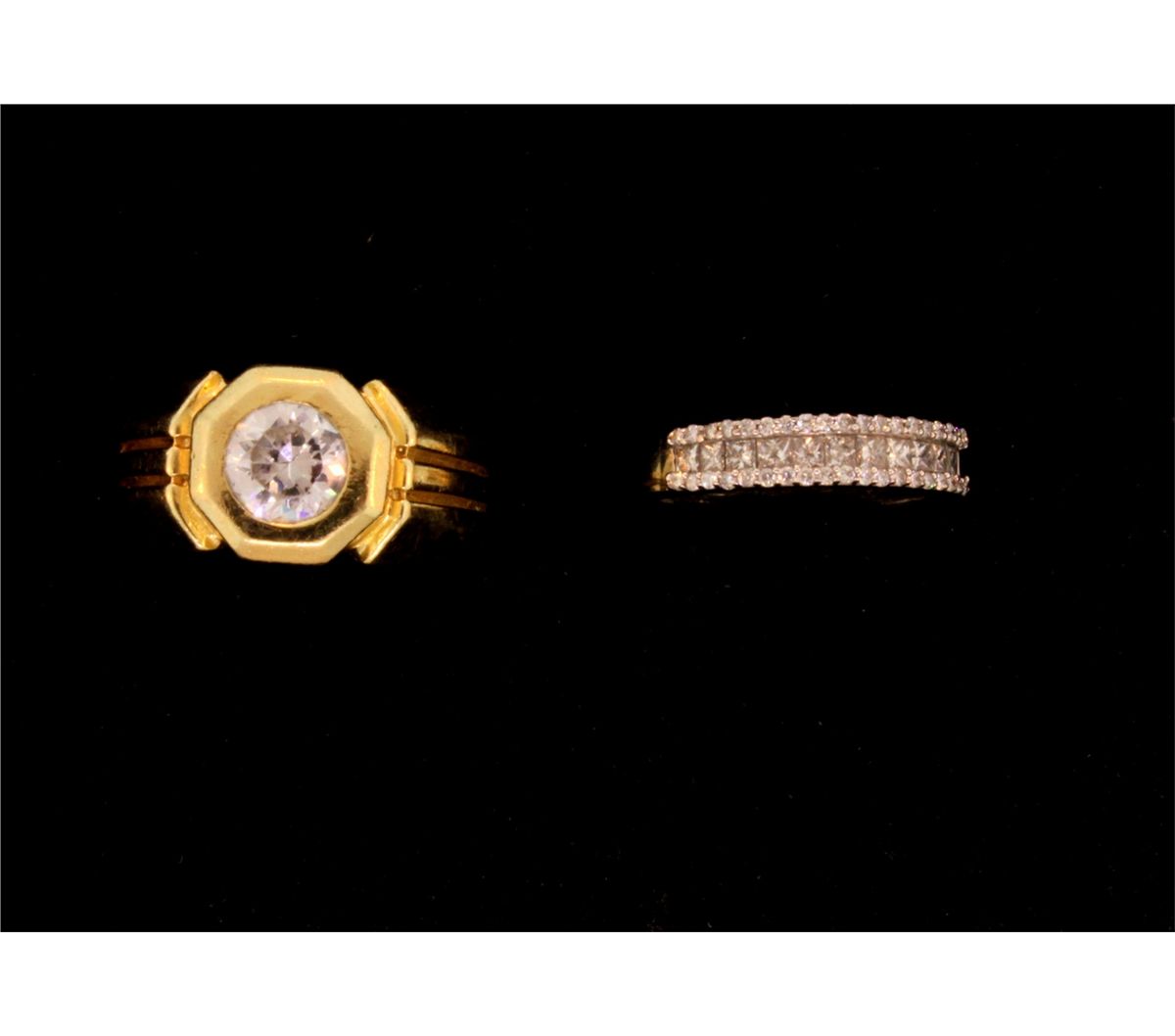 RING:  [1] 14KYG ring set with 1 synthetic clear stone size, 10: 7.5 grams.RING:  [1] 14KWG ring set with rd and princess cut diamonds, est. 0.74cttw, Good, I-J, SI2-I1, size 7;  4.3 grams.