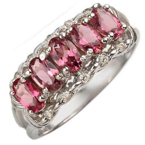 A multiple threat of gems This ring features faceted oval pink tourmaline in prong settings center the ring, and round diamond accent on each side of row.<BR><BR>This October birthstone's name comes from the Sinhalese word 'turmali' and believed could encourage artistic intuition.