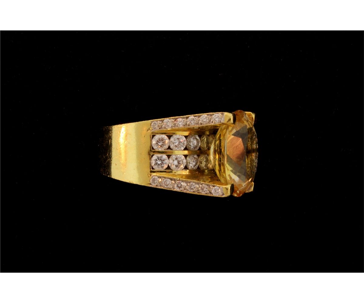 RING: [1] 18KYG ring set with 40 rd dia.s, TWA 2.85 cts, G-I, SI1-SI2; and [1] oval faceted yellow sapphire, 16.5 x 13.65 x 8.3mms = approx. 14.88 cts., fine color and quality; size 8; 32.7 grams
