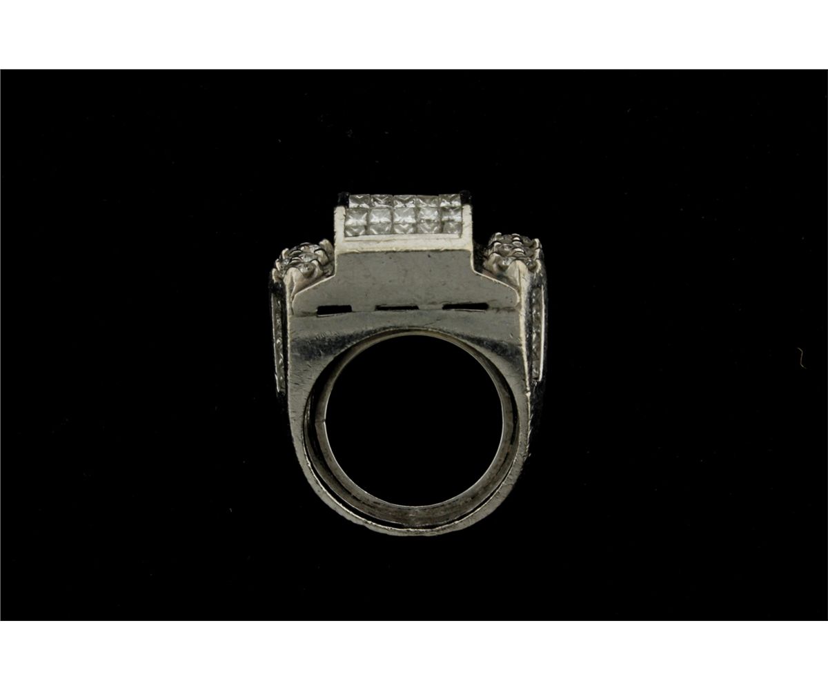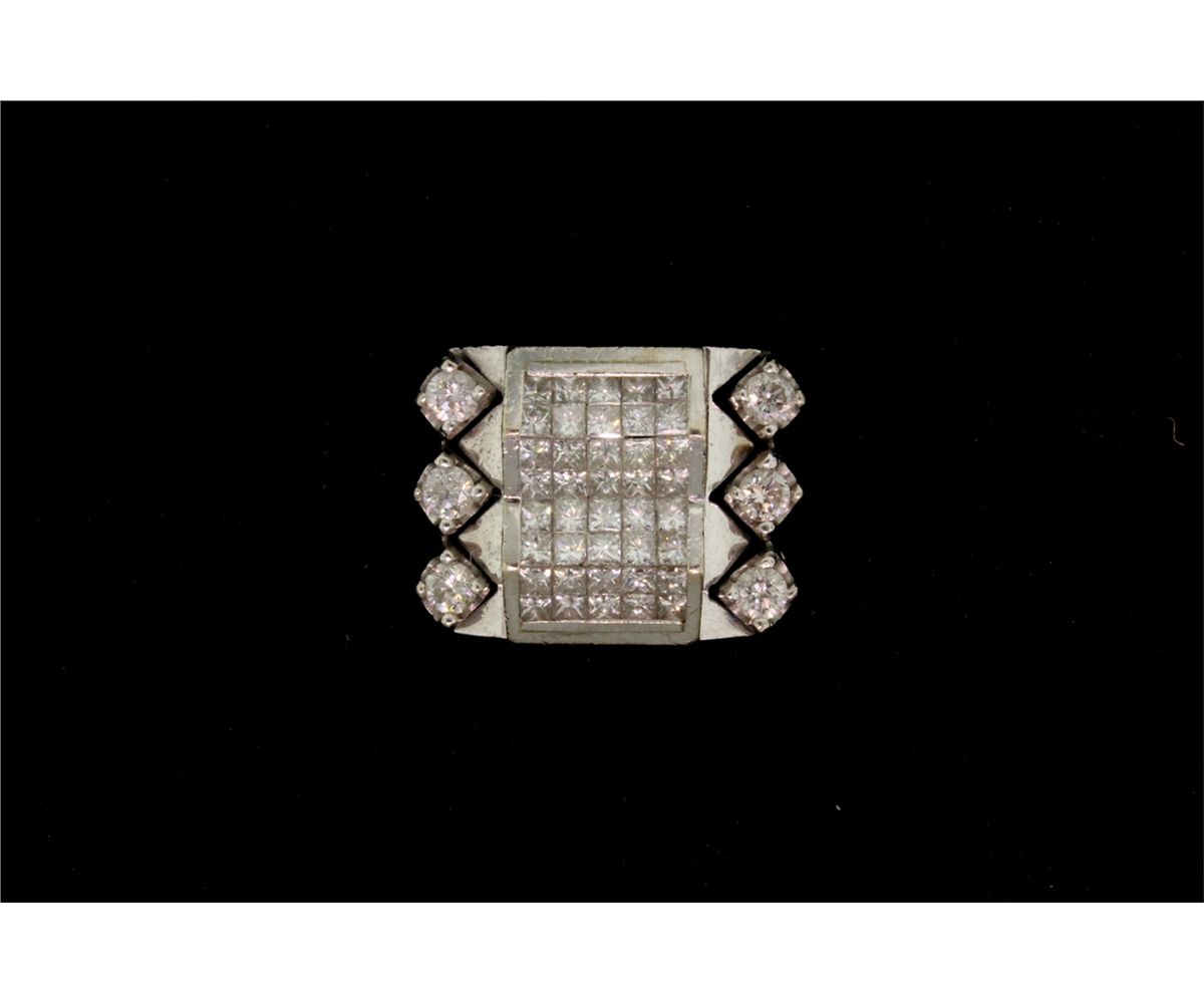 RING: (1) Gents 10kwg and dia ring 19mm wide and channel set with (100) princess cut dias and (8) rbc dias I1 - I2 clarity H-I color, approx. 4.00cttw. Size 5 1/2. 32.3g.