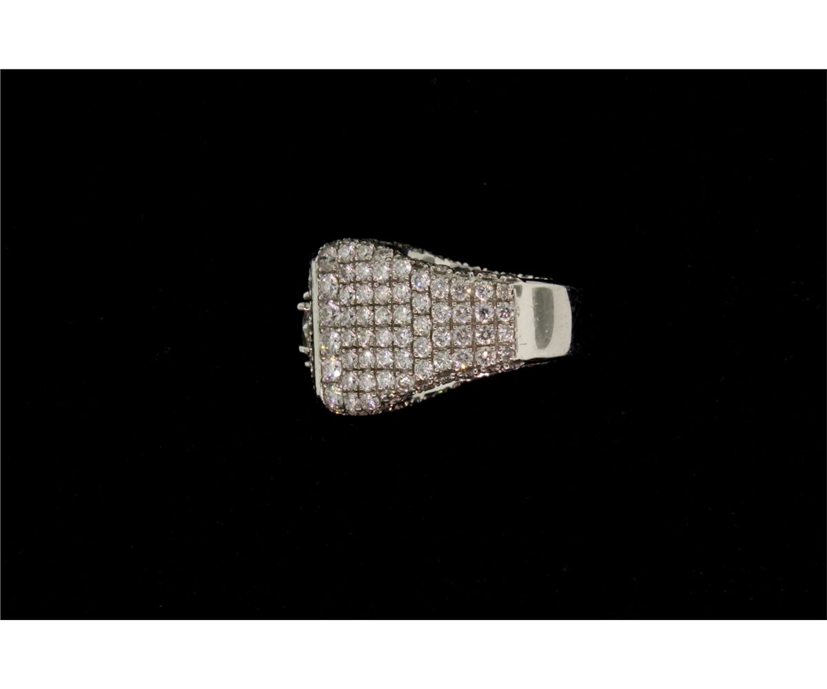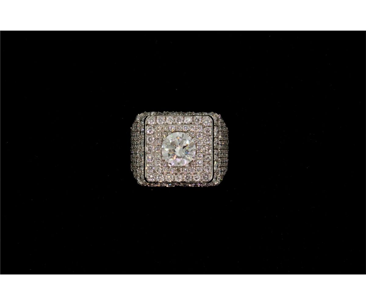 RING: [1] Gents 14kwg (tested) and dia ring. Prong set in center is (1) rbc dia 7.38mm diameter. (Depth unknown due to mounting.) approx. 1.30ct, I1 clarity. Laser drilled. H-I color, with good polish and symmetry. Bead set in the mounting are (232) rbc dias, SI2 - I1 clarity, G-H-I color, approx. 4.20cttw. Size 8. 17.4g. Hallmarked ED.