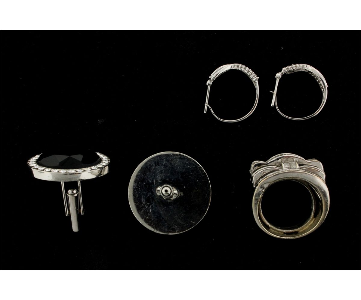 RING: [1] Gents dia and 10kwg ring 22mm wide and channel set with (80) baguette dias and (42) princess cut dias (two are missing) I1 clarity, I-J color (gray hue) approx. 2.50cttw. With sterling ring sizer, size 6 1/2. 25.9g. CUFFLINKS: [1] Pair copper plated cufflinks with round dark gray rhinestones 28mm diameter. Some plating missing on findings. EARRINGS: [1] Pair diamond and 10kwg (stamped) hoop earrings 20mm diameter with (48) rbc dias and (38) baguette dias I2 - I3 clarity, H-I color, approx. 0.50 cttw. 2.7g.