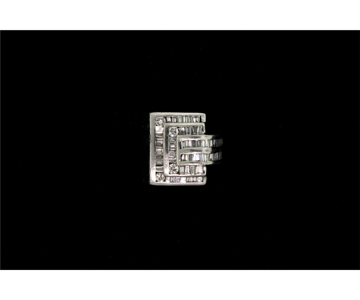 RING: [1] Platinum diamond ring set with 64 baguette and 4 rd diamonds, TWA 2.0 cts, H-J, VS1-I3; s