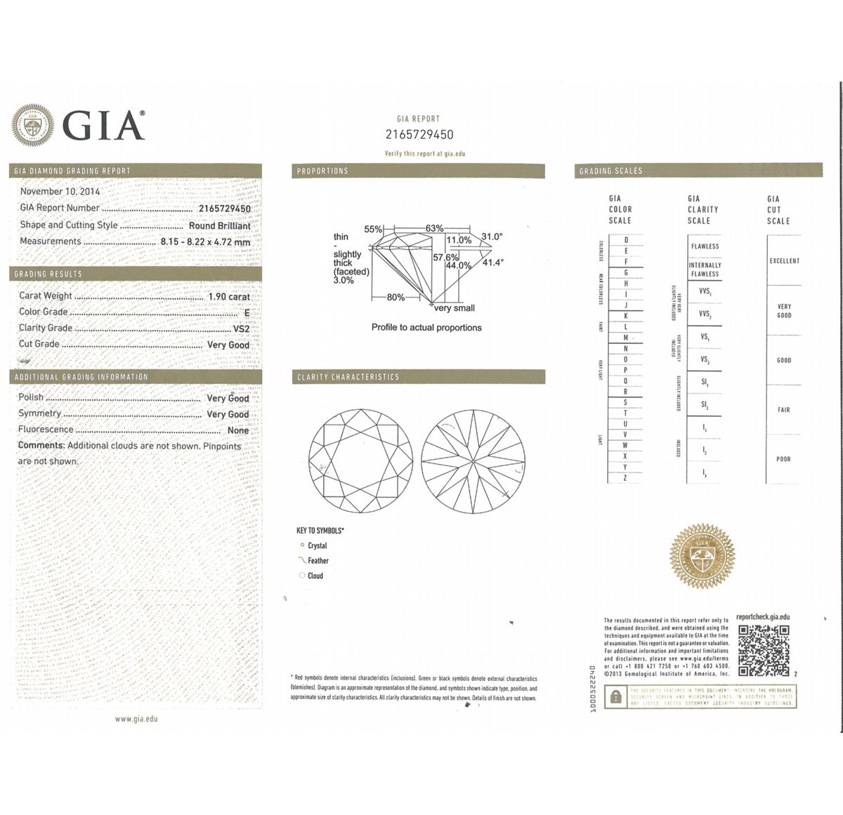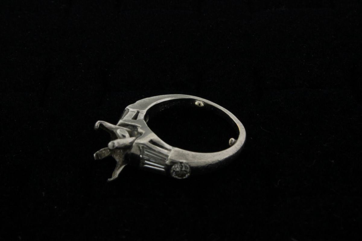 RING:  [1] Platinum engagement ring set with 2 round and 6 baguette cut diamonds, approx. 0.70 cttw., v. good/ I-K/ VS2-SI1; and in the center is a round brilliant cut diamond, 8.15 - 8.22 x  4.72mms = 1.90 cts,, v. good/ E/ VS2, GIA Report #2165729450; size 4 1/2 (with sizing balls in shank); 7.7 grams