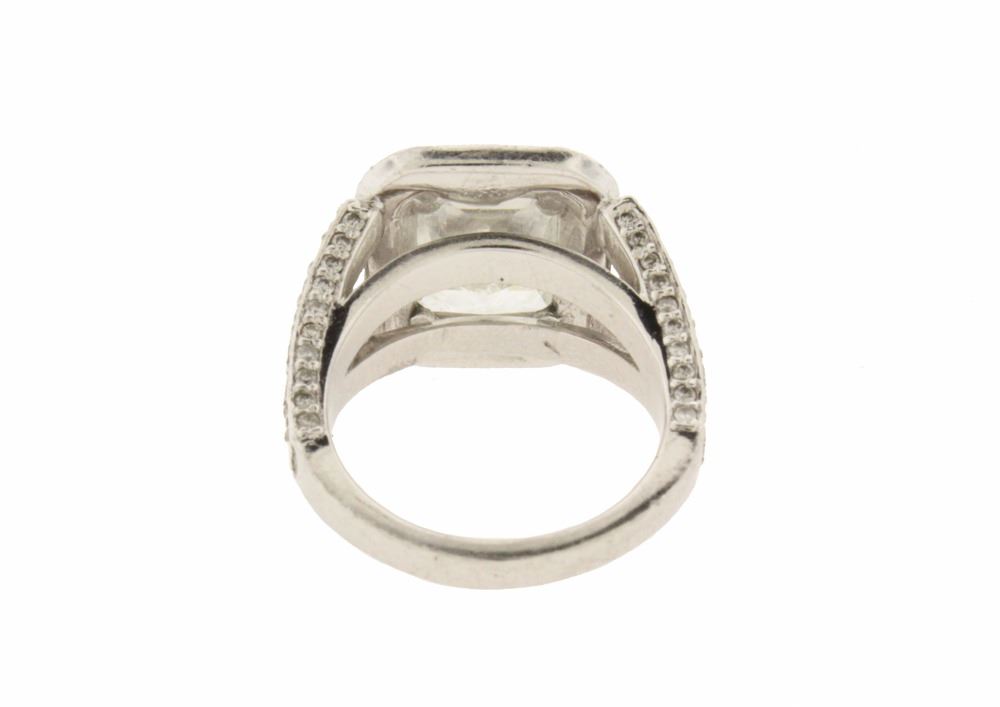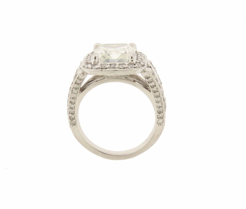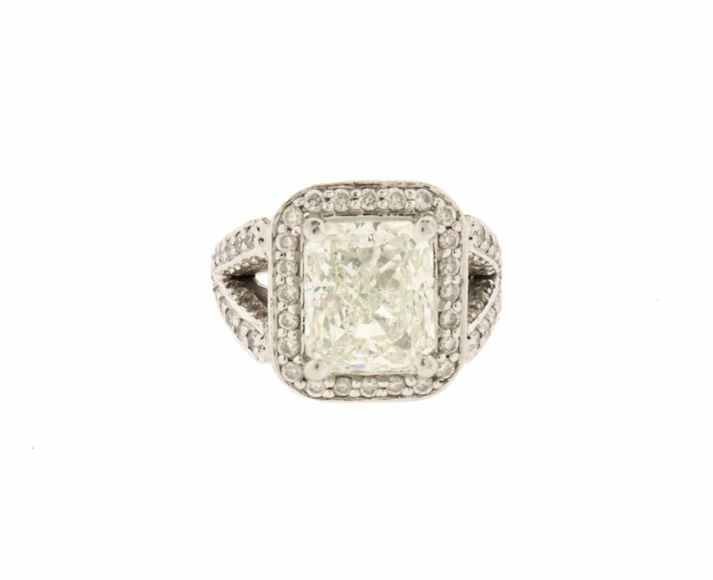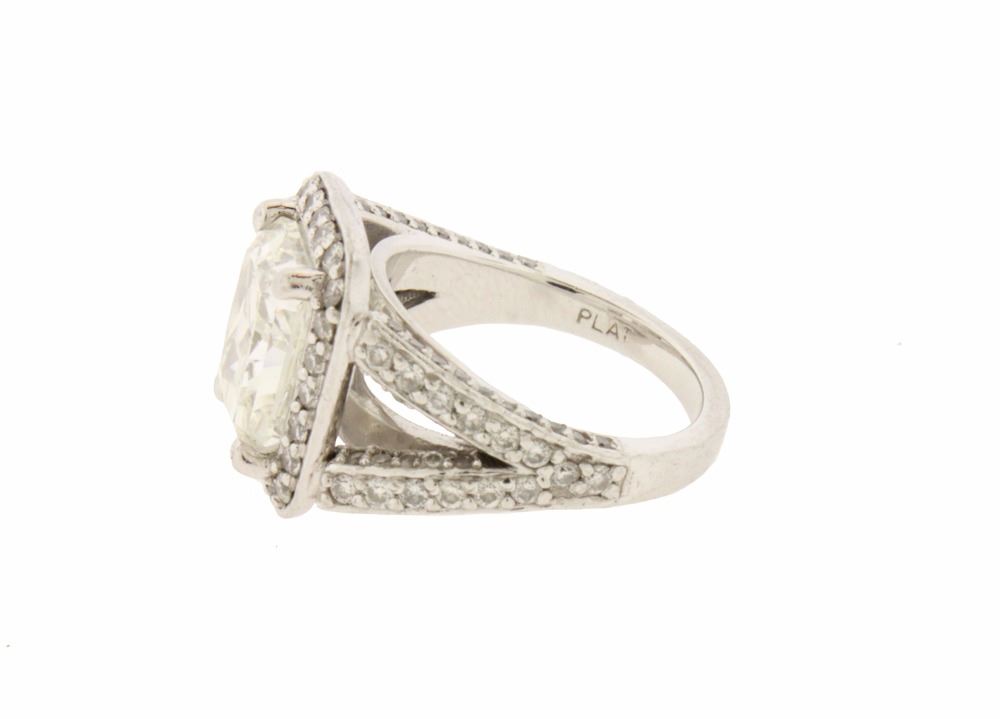 RING: [1] Platinum ring set with a cut cornered rectangular modified brilliant (radiant) cut diamond, 9.57 x 8.15 x 5.69mms = 4.01 cts., good/ J/ VS1/ GIA Report 1136276223 (2011); and 112 round diamonds, approx. 1.24 cttw., good/ I-J/ SI1-I1; size 4 1/2; 11.5 grams (GIA report is not included.)