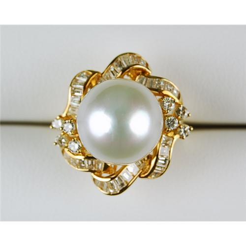 This 18K Yellow Gold Estate ring features the most beautiful RARE 11MM SOUTH SEA PEARL. It is surrounded by FINE QUALITY DIAMONDS, Round and Baguette.